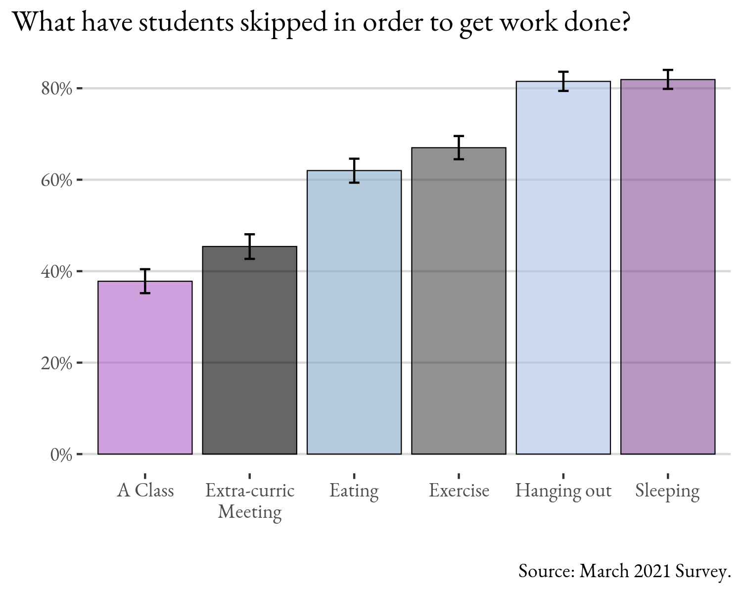 You start skipping things. You start triaging certain events in your life into categories of “I should definitely do that” and “Will it really matter if I skip?” This is a situation Denison Students find themselves in all too often and constantly find themselves making those decisions. In the March 2021 survey, Denison students were asked “Have you ever skipped any of the following in order to have more time for studying/homework?” and were told to check as many as apply from the choices shown in the figure below: