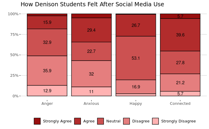 Just like most young adults, social media plays an important role in many Denisonians’ lives. A past 127 writer, The Darian of Harrington, found that 79.3% of Denison students have reported using their smartphones at least 3 hours a day. With such a heavy usage of smartphones (and thus social media) in their lives, how does social media affect the lives of Denison students? In the March 2021 survey, Denison students were asked several questions about their social media usage and its effects. They were asked, after being on social media, if they felt more angry, anxious, happy, and connected to others.