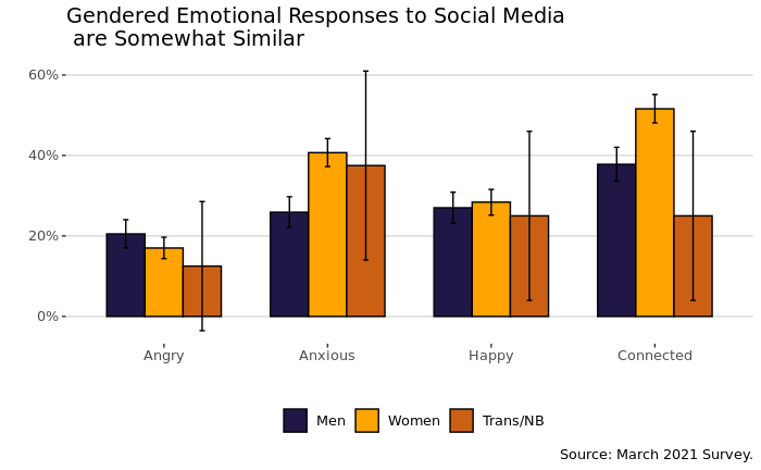 While men feel angrier after social media use and women feel happier after social media use, these results were not significant. 21% of men reported feeling angry after social media use compared to 17% of women, and almost identically 28% of Women and 27% of Men reported feeling happier after social media usage. Both of these results were not significant at the .05 level.