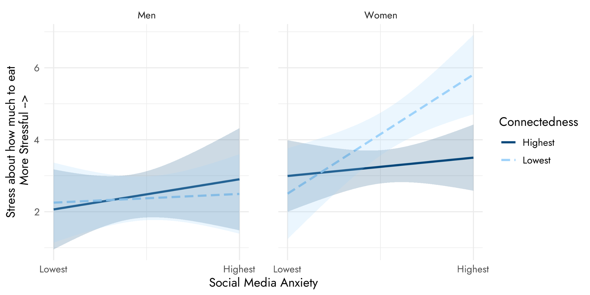 There was no link between anxiety from social media and stress about eating for men, but that was not true for women. Women who feel disconnected and anxious from social media are more likely to have stress regarding how much they eat. However, women who feel connected to others on social media do not take on stress about eating when social media anxiety soars.