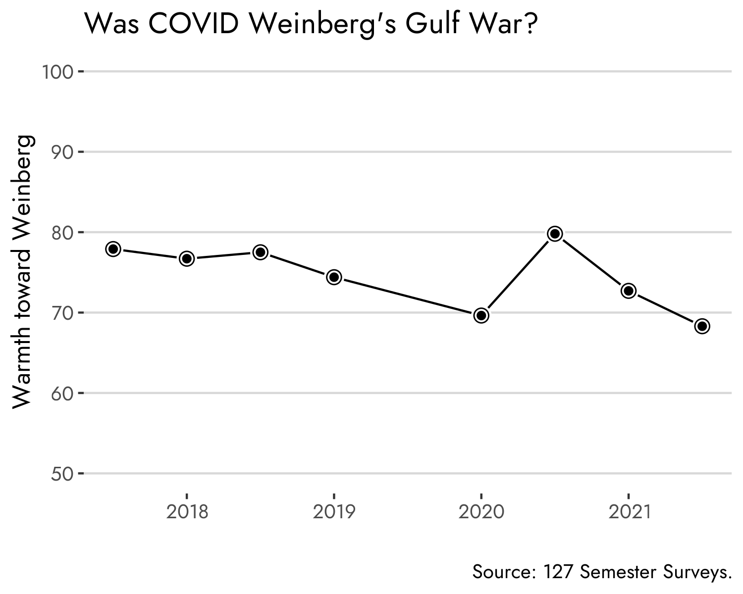 The President has been the subject of 127 posts before. Bobby Craig analyzed writing to catalogue “Weinbergisms” and Max Dehon looked at favorable ratings in Weinberg’s “second term.” In the latter piece, Dehon compared Weinberg to George W. Bush, whose ratings were sliding in his second term, which is pretty typical of American presidents. The last rating drawn on for that post was February 2020, which begs the obvious question – what did COVID do to feelings toward President Adam Weinberg?