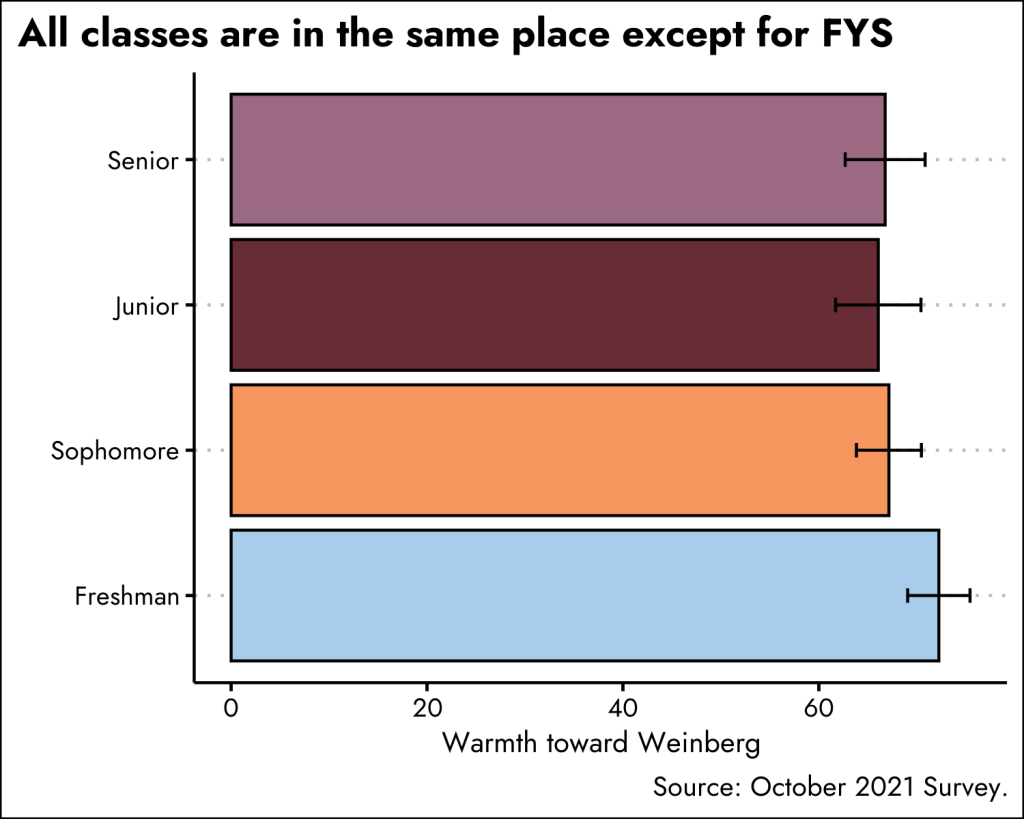 So, whose feelings toward Weinberg are cooling off? Despite the rally around the flag in fall 2020, COVID has taken its toll and everyone just seems tired. I could imagine that those students who have been through a COVID tour of duty may report a lower degree of warmth than newbies who don’t know the full force of the Campus Compact. There’s some evidence for that below – everyone is in the same place except for freshmen who have slightly higher warmth scores.
