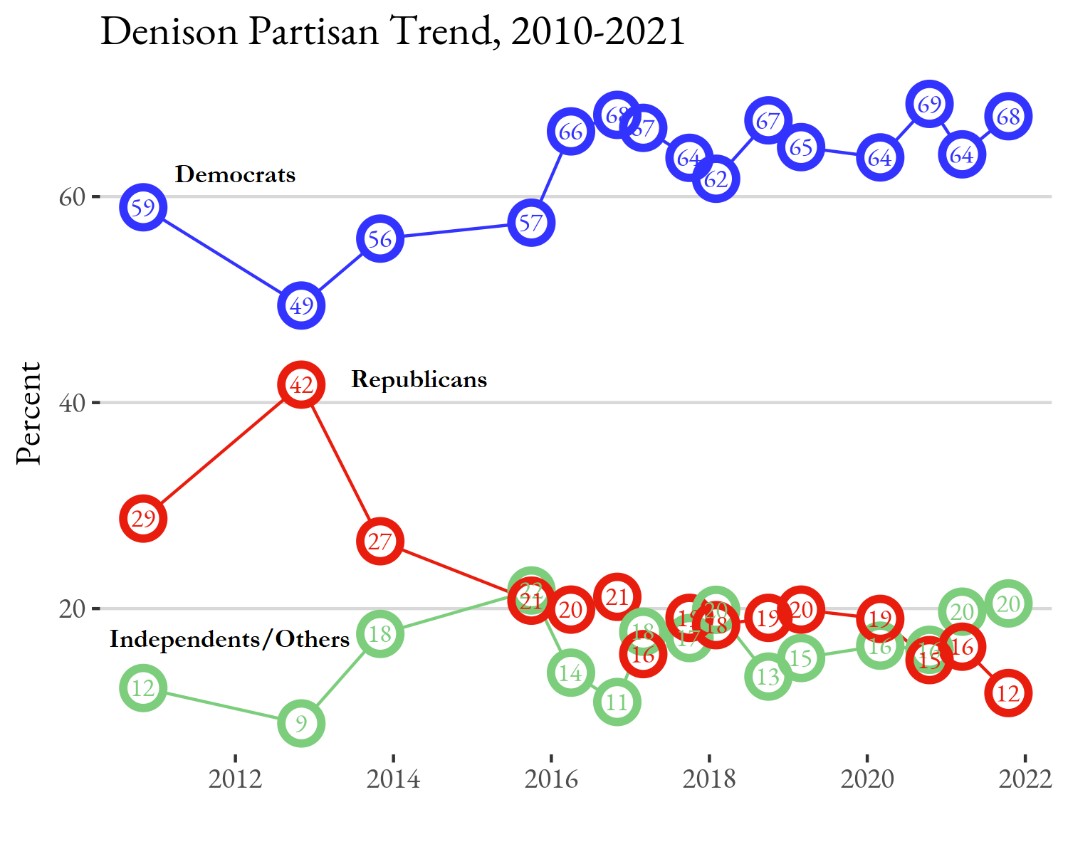 Perhaps it’s just a trend seen on college campuses. They are so-called “liberal bastions” after all. Why? Some blame liberal professors, however, there’s just no evidence that students become more liberal in college. Studies drawing on random assignment of students to first year roommates find that partisan changes have more to do with social interaction patterns among students, results consistent with a very wide range of behaviors roommates affect. Nathaniel Nakon reached the same conclusion with Denison data tracking cohorts across their 4 years – college does not eat conservative brains at Denison.