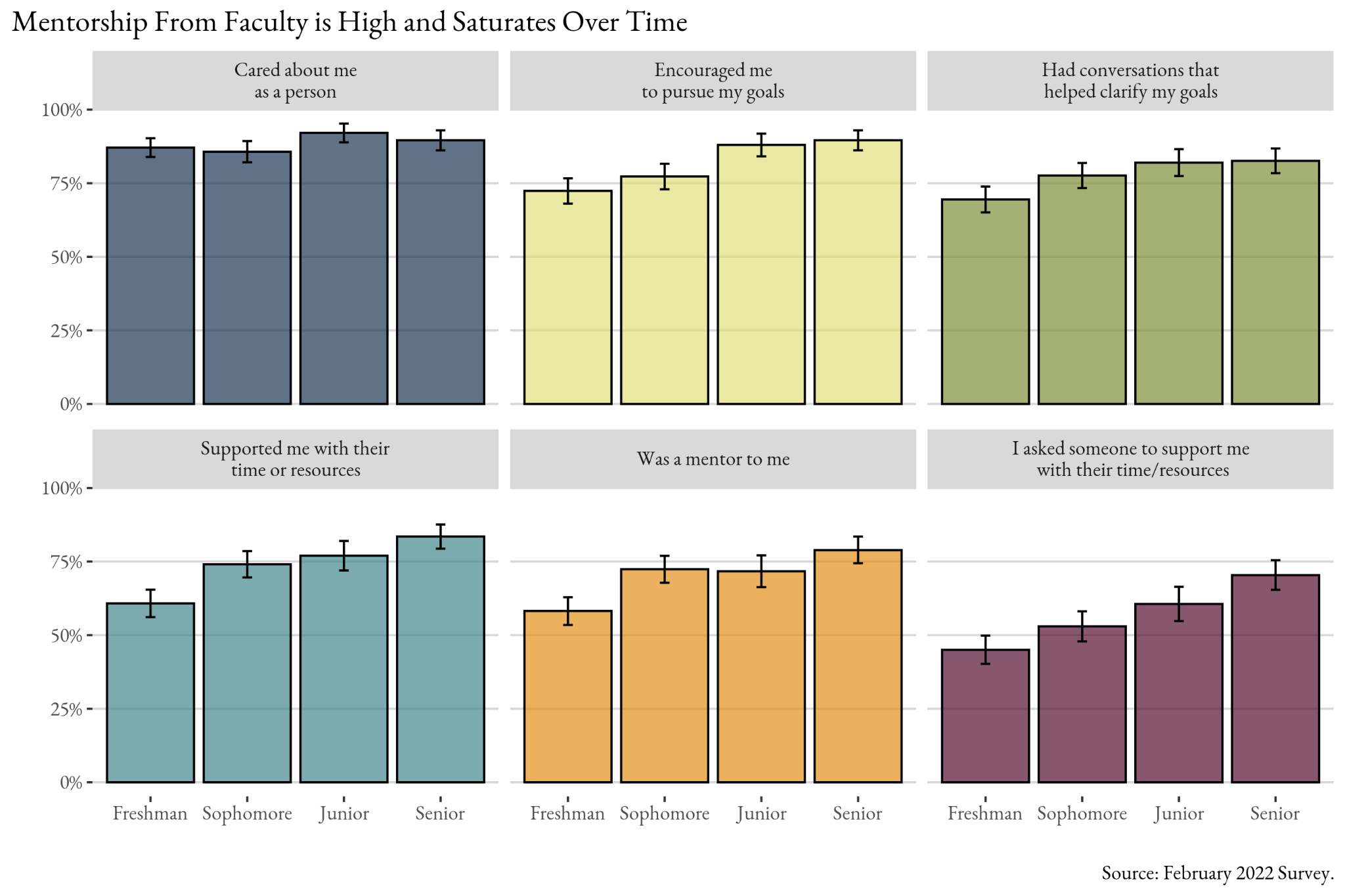 In our February 2022 survey of 512 students, we reprised questions about mentorship at Denison that we asked before in the spring of 2018 (with the best cover photo of any on 127 – thanks Logan Mallory!). We think that mentorship is generally about support that is reflected in the range of questions we asked – about concern, encouragement, processing, and investment. The results concerning faculty are in the figure below. The rates of reporting the various forms of mentorship are high and grow across the four years to above 75 percent of the senior class. Notably, mentorship occurs whether students ask for it or not (bottom right panel), which suggests (rightly!) that faculty are looking for opportunities to have these conversations. But asking for support is much more likely to net you a mentoring relationship with faculty.