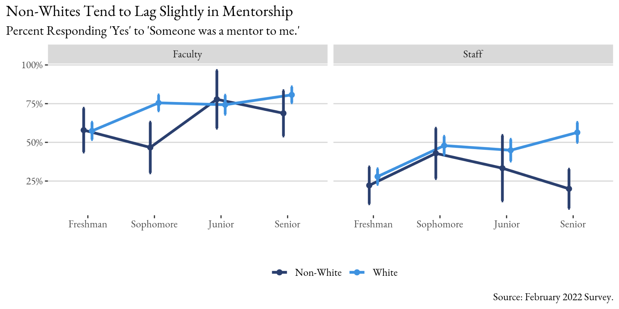 The same sort of pattern may overlap with race, which the following figure explores. Non-white students (we left out international students for this analysis) lag behind white students in having faculty and staff mentors consistently, but only by a small amount. Both groups generally increase in faculty mentorship across their four years except for sophomore non-whites. On the staff side, non-white students start climbing, but then drop off after sophomore year. We asked around and there do not seem to be any programmatic reasons for this. It’s hard not to picture the role of COVID in this, as the Junior and Senior classes had chances to make friends before COVID changed how we live our lives, while Sophomores were stuck with severe COVID regulations their first year – the year many make their core friendships. By the way, we checked to see if race interacts with first gen status, but no – the same first gen gap can be seen among non-whites vs among whites.
