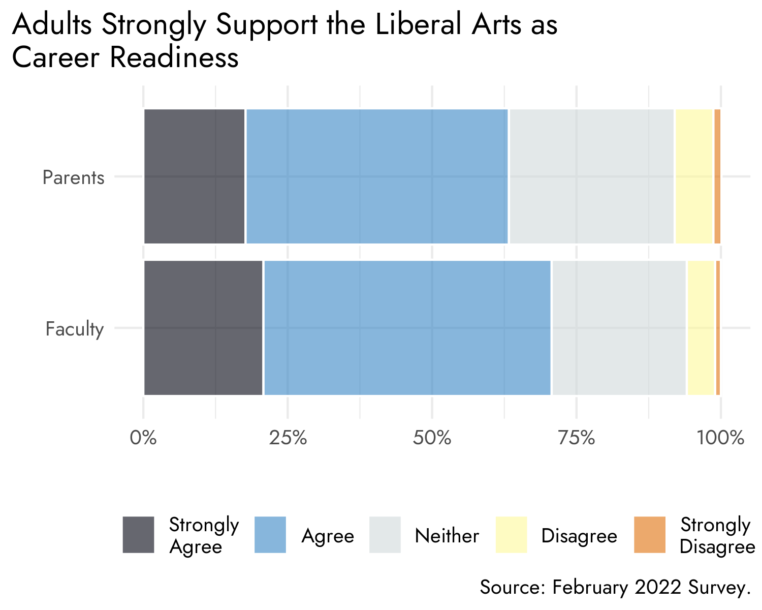 The cultural narrative about career readiness and liberal arts is so strong that the tension between them is felt at Denison despite the school, professors, and parents arguing the opposite. Two-thirds of students agreed that their parents believe a liberal arts education promotes career readiness. Additionally almost three-quarters of the students surveyed said professors think the liberal arts promote career readiness. Despite both of these important influences, 40% of students feel there is some tension.