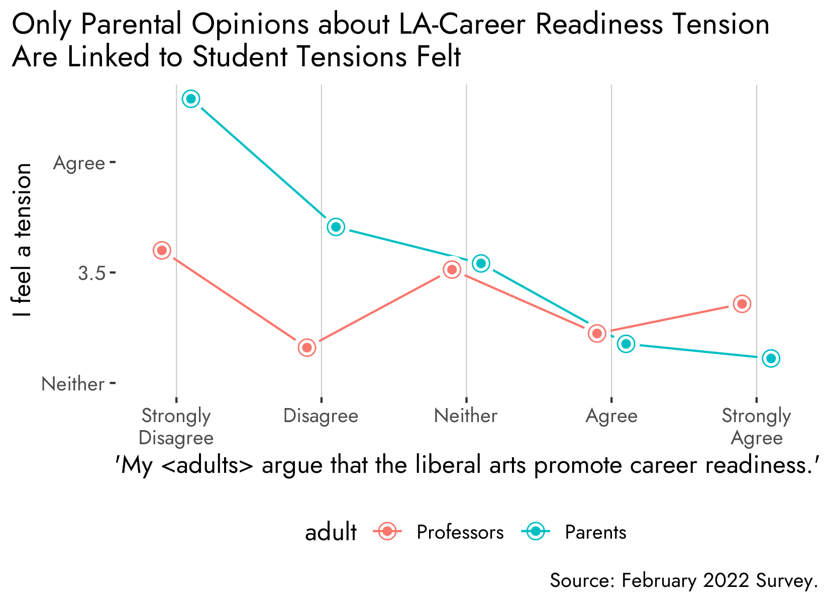 Are any of the adults in the room getting through? Do students feel less tension when they have parents and faculty who support the role of the liberal arts in career readiness? It seems that professors have no influence in this regard (see below) – no matter their perceived opinion on this tension, students feel some tension. Instead, students appear to reflect their parents’ attitude on this question. Students definitely feel a tension between the liberal arts and career readiness when they believe their parents feel that way too. Interestingly, there just doesn’t seem to be a way to break through these feelings of tension. No force we looked at gets the average score to a place where they disagree with the tension.