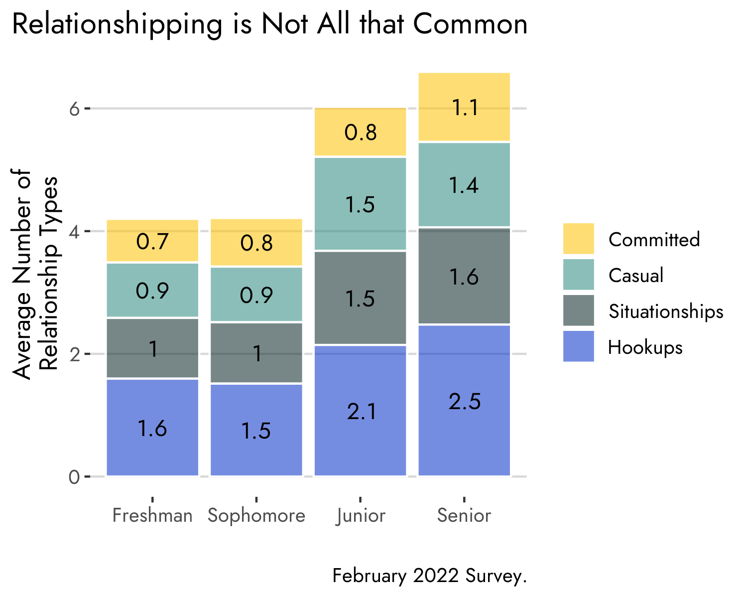 There is a pretty extensive vocabulary in our culture regarding how people classify their relationships and that’s true of the Denison lexicon. For this survey we broke down types of relationships into four categories (the parentheticals were listed in the survey: Committed (exclusive, “dating”), Casual (open, not committed, more than nothing), Situationships (if we happen to be in the same place, then sure), and Hookups (entirely of the moment). Seniors have the highest number of relationships of all sorts, averaging just over 6 of all types (the maximum respondents could list was 5 in each category). Freshmen and sophomores are not all that far behind, averaging just over 4 of all types. That pattern suggests that during your first two years at Denison, people are engaging in all sorts of relationships and just trying to figure out what their standards are when it comes to dating. The only real difference between the Junior and Senior data results is that the Juniors are in less committed relationships. This could be due to the fact that a large majority of Juniors go abroad, and have less time at Denison to meet someone that could turn into a committed relationship.