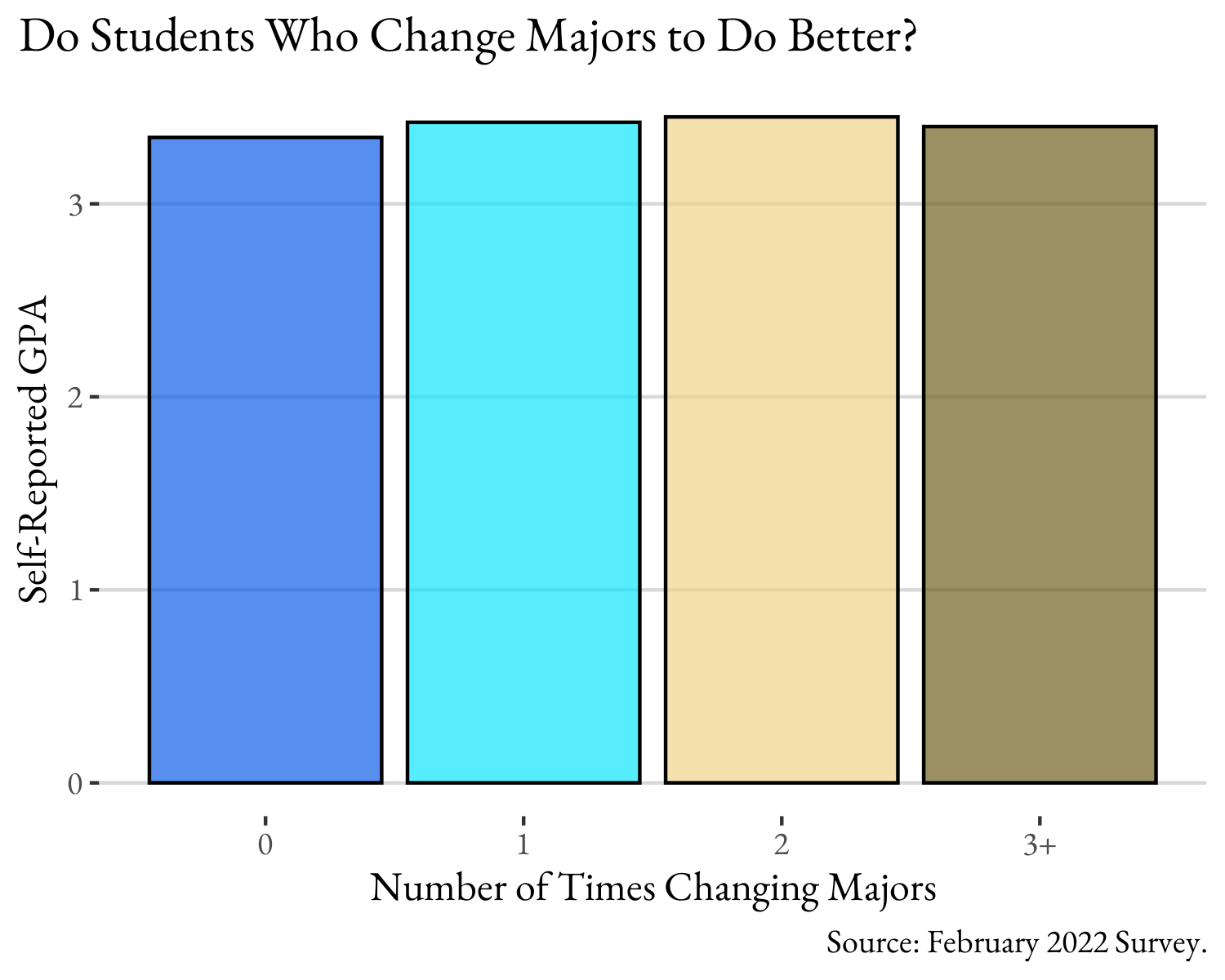 There is surely some push and pull of changing majors – some are drawn to the questions, methods, and professors, while some are surely nudged to find greener pastures (i.e., they weren’t getting good grades). Can see any evidence of this in the data? Not really. Well, there is a slight bump for those who have changed majors, but it is not statistically significant. The average GPA for those who haven’t changed is 3.34 while it rises to just above 3.4 for everyone else who switched. That’s a pretty small difference.