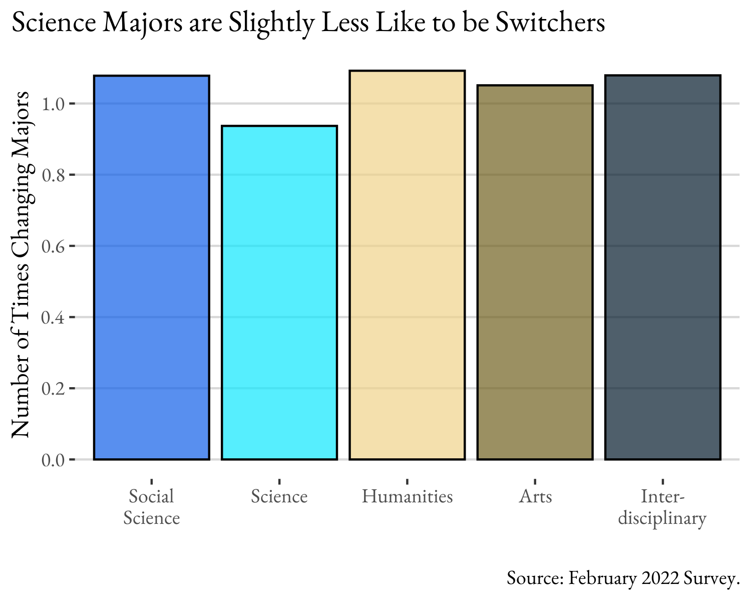 Those who have changed majors have slightly more majors (1.3 versus 1.2 for those who haven’t changed) and I expected to see certain kinds of majors changing more. Maybe I’m just projecting, but when I applied to college I wanted to be a chemistry major and then never took a chemistry class in college! That is, I bet that non-science majors are more likely to come to that decision because of changing majors. There’s some meager evidence for that notion – science majors do indeed report slightly fewer major changes (.93), while all other majors report equivalent numbers of switches (just over 1). But none of these differences are statistically significant.