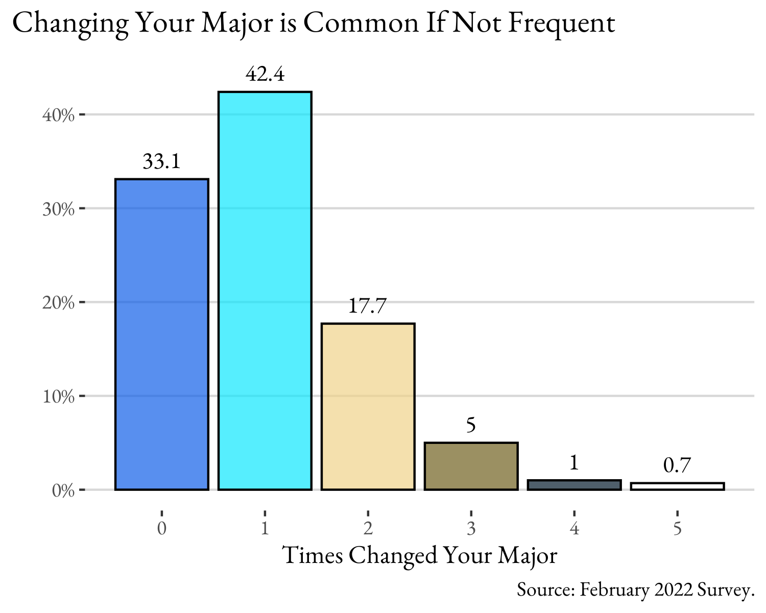 I’m drawing on our February 2022 survey data of 508 students, which asked, “Thinking back to when you first started at Denison, how many times have you changed your intended major?” The response options topped out at 5 and that proved adequate as the following figure shows. Only a third of students say that they have not changed their major since enrollment, which means two-thirds have. The modal change is once, but almost a quarter have changed majors at least twice. That’s a lot of change. It’s also interesting that this distribution looks almost exactly the way it did in 2018 when we asked this last. This is an enduring pattern.