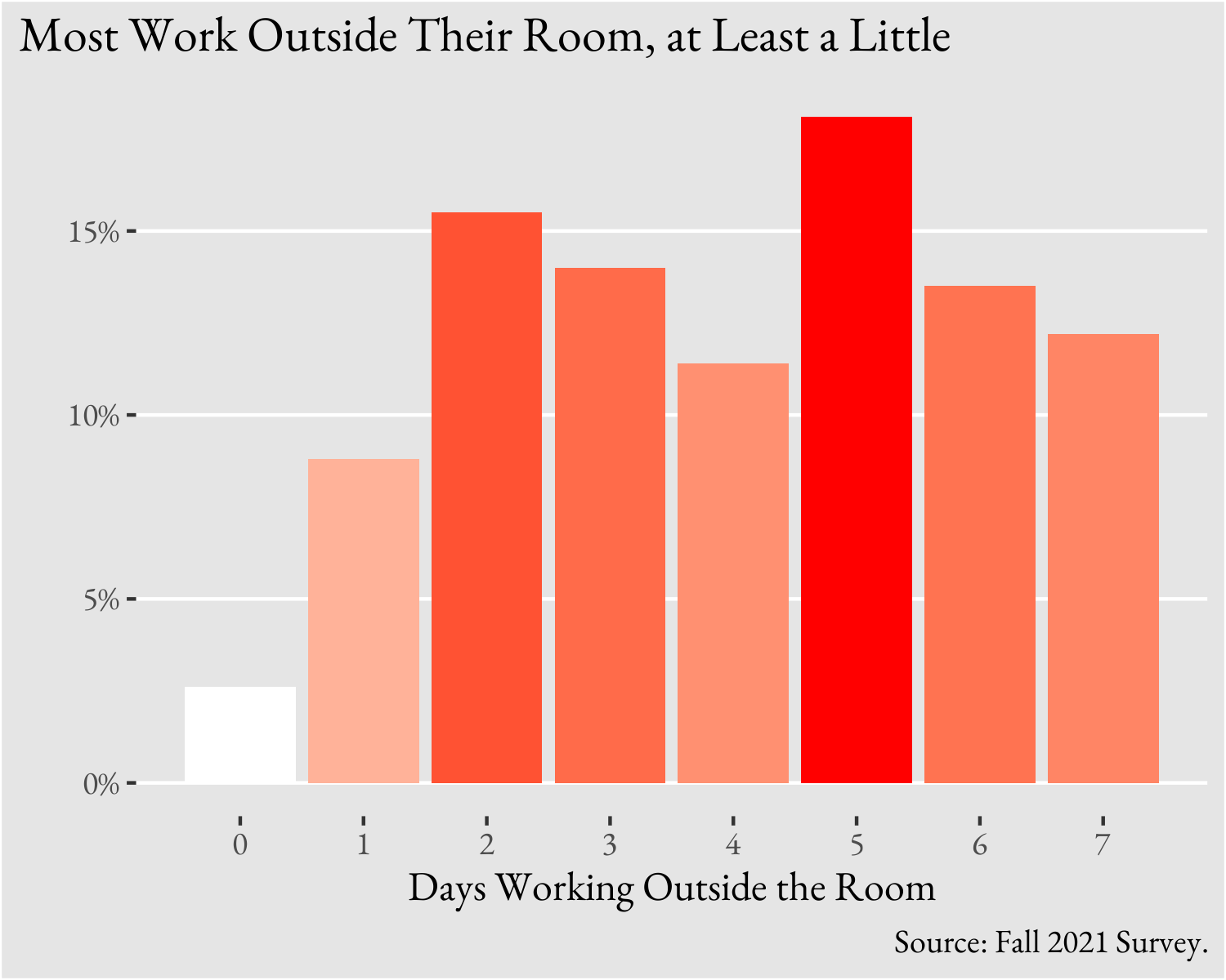 There’s some evidence that working outside the room is linked to academic success as measured by self-reported GPA. Those who work 7 days a week outside their room report a GPA that is about half a point higher (3-3.5) than those who don’t work outside their room. It’s important to note that there’s a hidden variable in the mix – this measure is surely also telling us how much they study and not just where they study. In some ways, that’s the point though. I strongly suspect that working outside the room is also linked to a greater amount of studying (though I can’t disentangle them in these data).