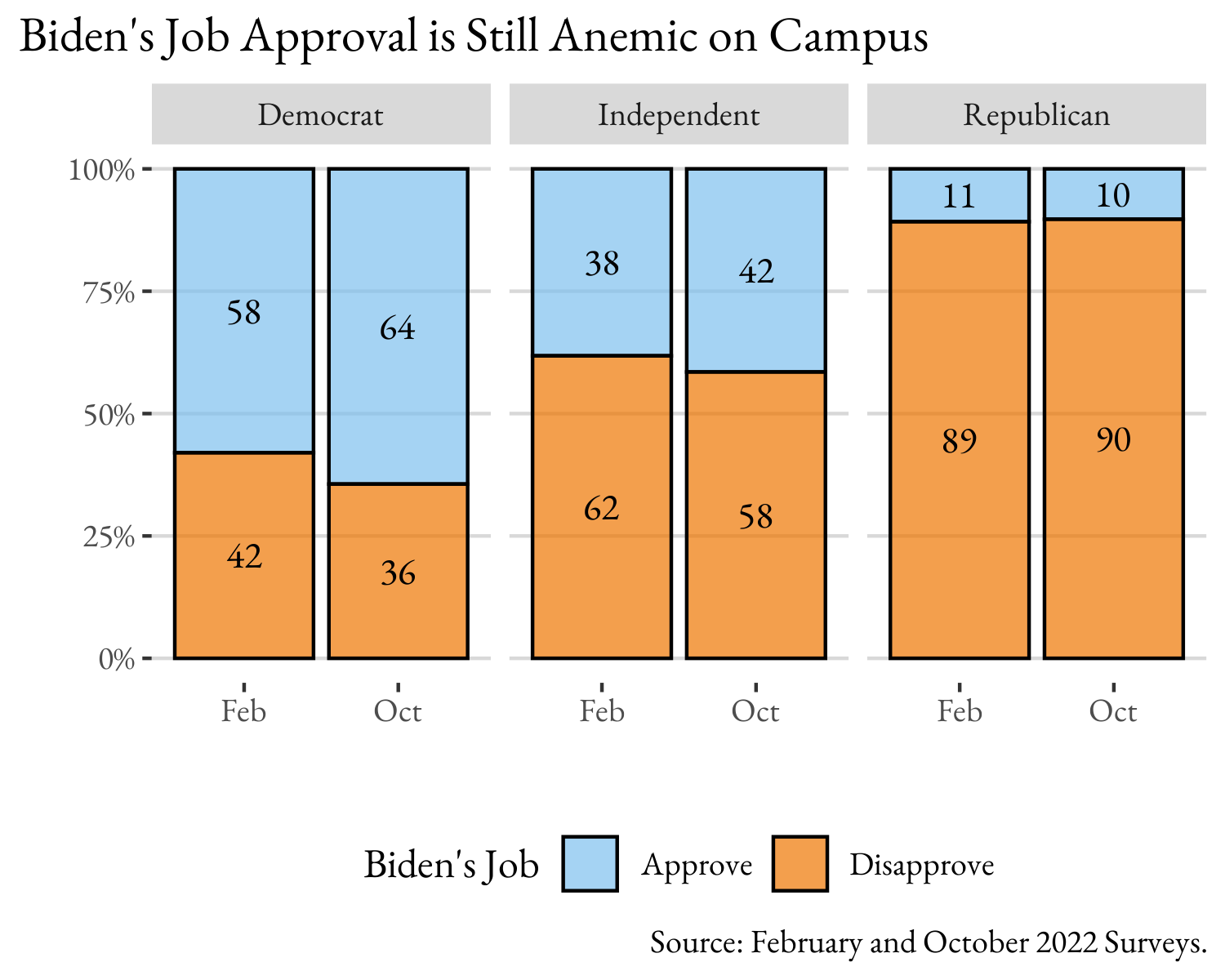 The figures below show the breakdown of Biden’s approval rating by partisanship from our two most recent surveys in October 2022 and February 2022. Here we can see that the Republican disapproval rating has continued to increase, while the approval rating amongst Democrats and Independents is low but has slightly improved.