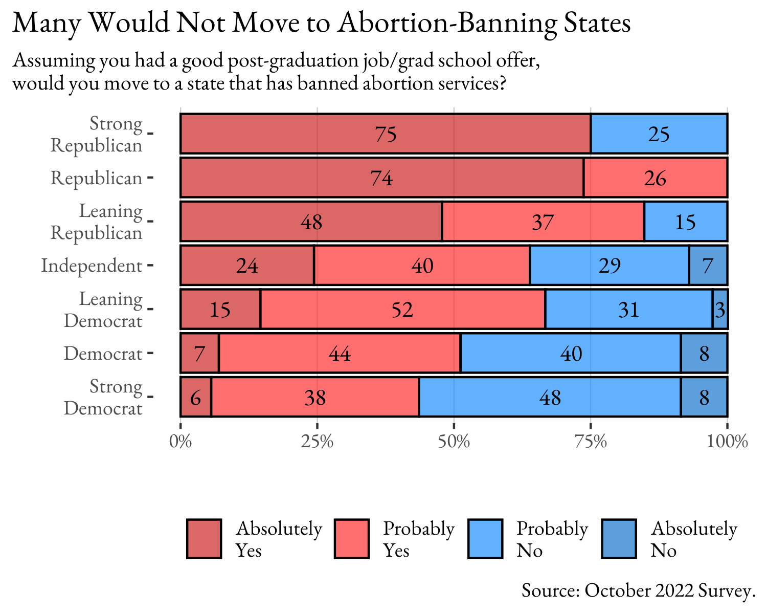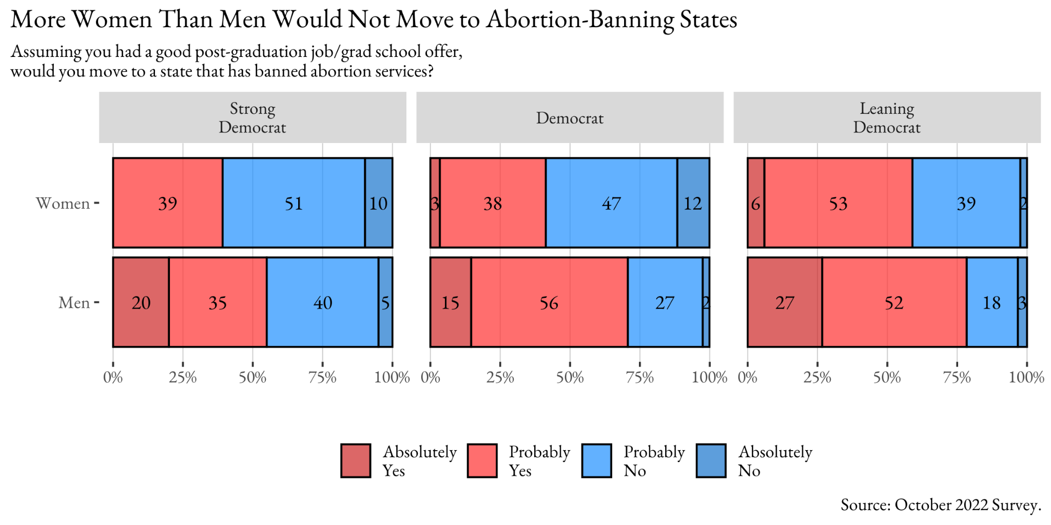 In the fall of 2022 Denison University students were asked “assuming you have a good post-graduation job/grad school offer, would you move to a state that has banned abortion services?” Both gender and political ideology have a strong impact on students’ responses to this question. About 75% of Strong and lean Republicans said “absolutely yes” while about 40-50% of Democrats and Strong Democrats said probably or absolutely no. Interestingly the conviction on this decision seems lopsided in favor of the conservatives with only 8% of Democrats or Strong Democrats saying Absolutely No. For many college democrats, the political cost of living in a state that banned abortion services does not completely outweigh the benefit of a good job or grad school offer.