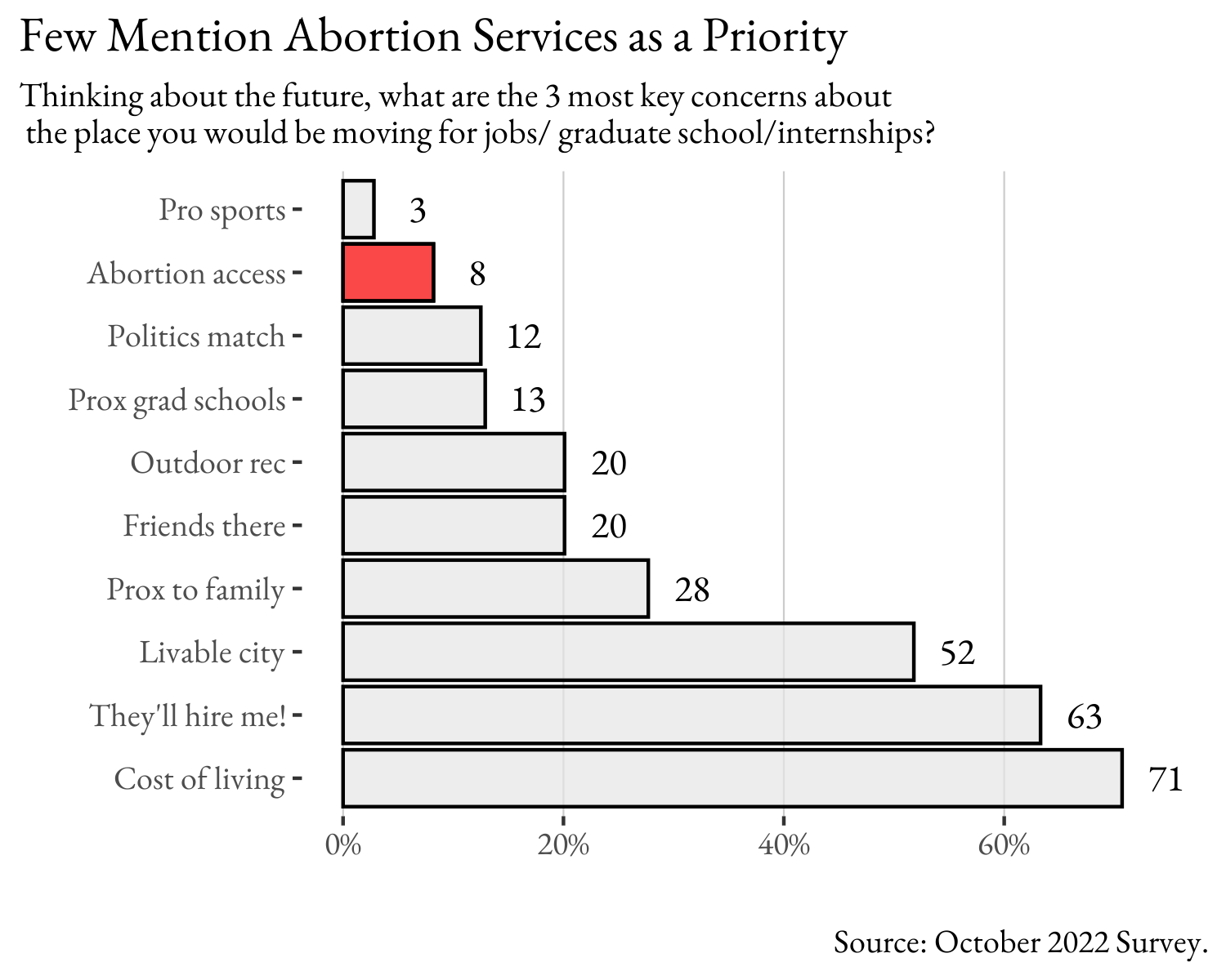 Students are willing to admit that they would take abortion into account when directly asked. But what about if they are not? In another set of questions, we asked what criteria they would consider when choosing where to move. Despite what seems like the inescapable political dialogue about abortion access, it is actually the second lowest priority for Denison students as they think about where they want to move after graduation. The top three are cost of living, that someone will hire them, and that the city is livable. I interpret this in the political sphere as people being concerned about safety, jobs/job security, and the economy or inflation. These three points were the core of the Republican Party’s talking points across the country in the 2022 midterms with rhetoric that focused on rising inflation and crime while there were democrats in leadership. The leading issue Democrats were hoping would get people to the polls was abortion, which ranks very low on this list.