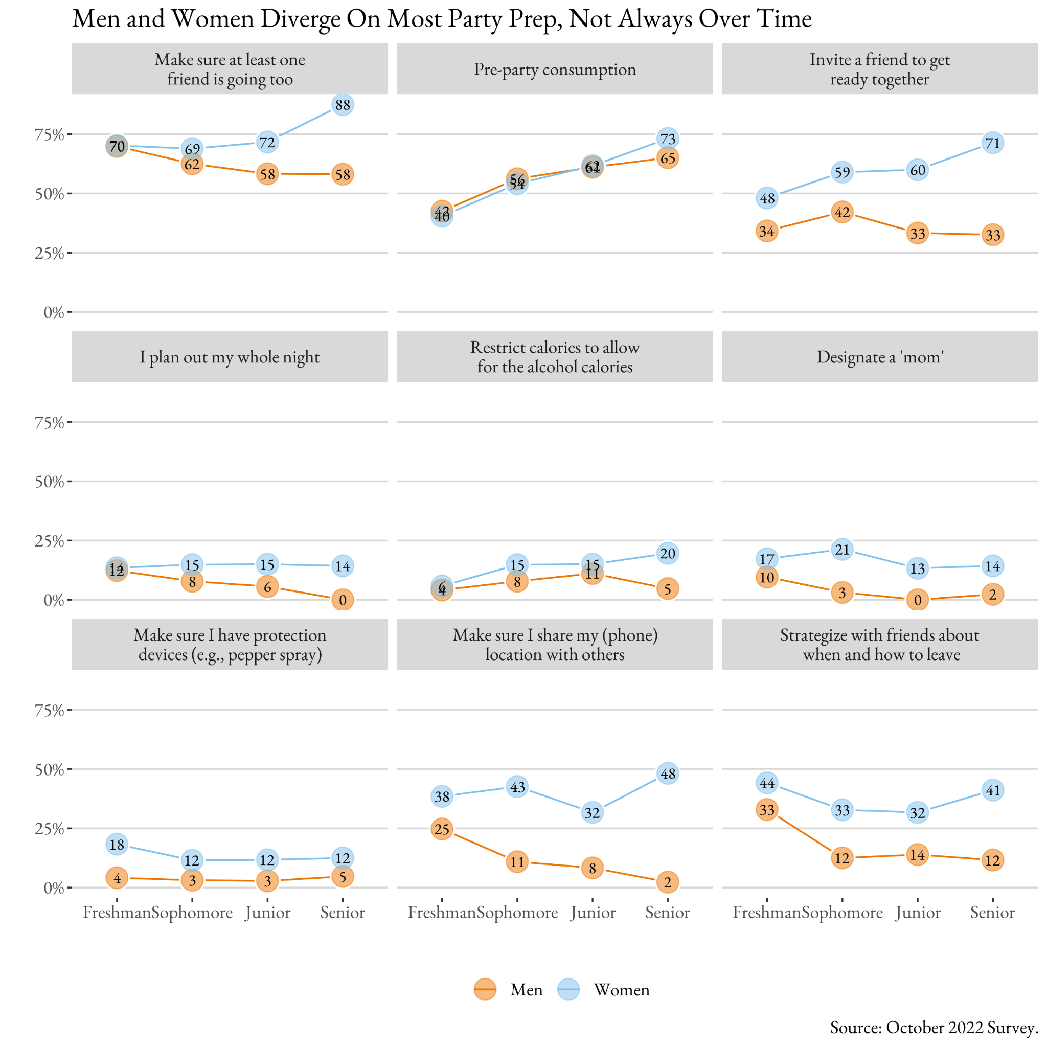 The data collected from our October survey suggests that while most students engage in some form of party preparation, there is a notable difference between men and women and how they responded to the safety party preparation questions. It seems that female students here align with the notion that they rest in fear of their night going south, causing them to follow through with safety precautions such as carrying pepper spray, sharing locations, and rarely ever entering and exiting a party alone. To some extent, though, much of the prep that we engage in is simply making sure we socialize with who we want to and that’s a gendered concern – women want to make sure their friends are going more than that motivates men.