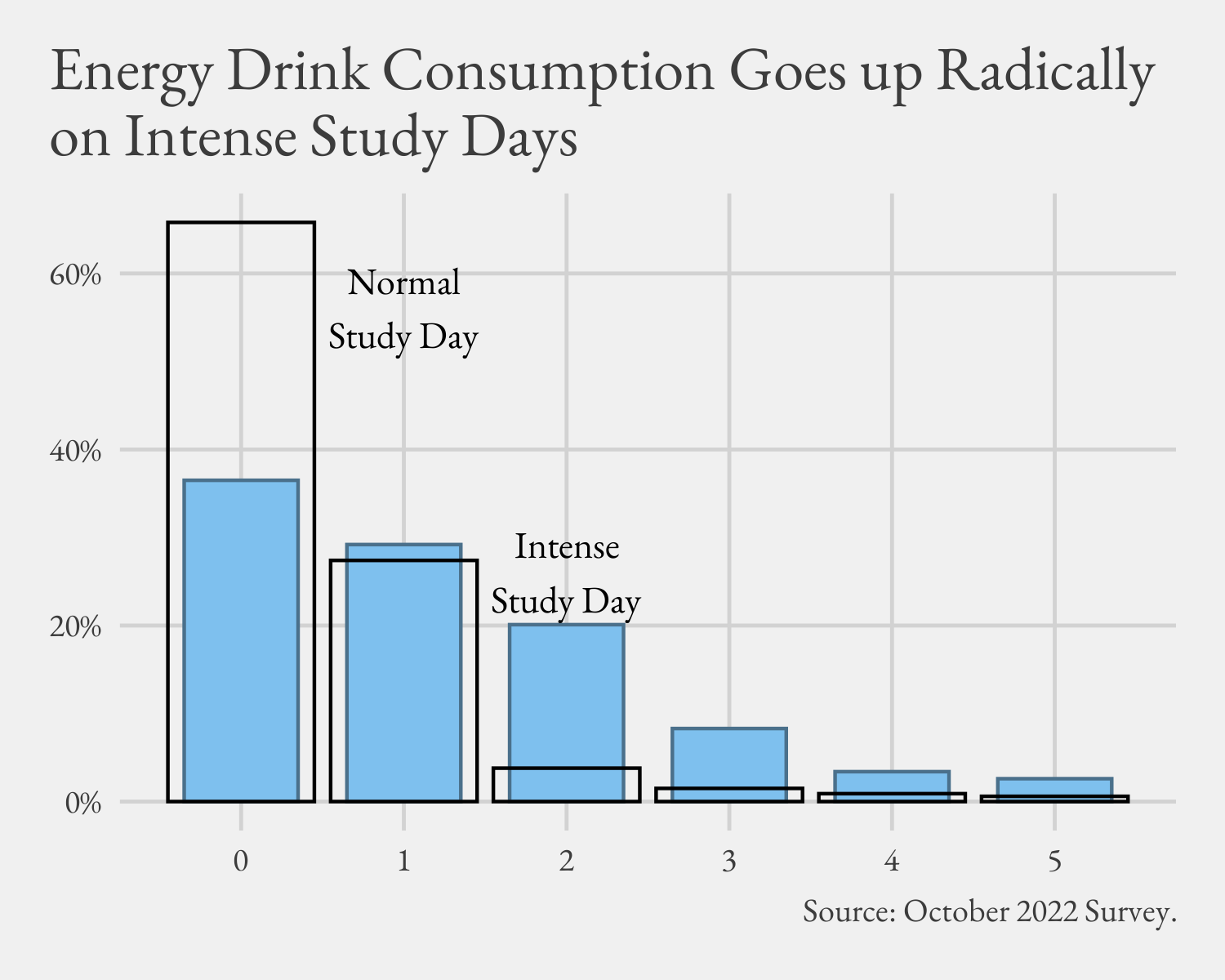 We asked 502 students in October 2022 about their energy drink consumption. On any given day, energy drink consumption is not exactly rare, but is not a majortiarian practice – about a third (34%) say they have one on the daily. That stat puts Denison right in line with research about young people more generally. However, when the workload piles up, so do the empty cans of the nasty. In that case, more like two-thirds of Denisonians have one (64%), and about 10 percent will go on to have 3 or more that day. With numbers like that, it is highly likely to plague most of campus, but it’s worth finding out what groups are more hooked on the can than others.