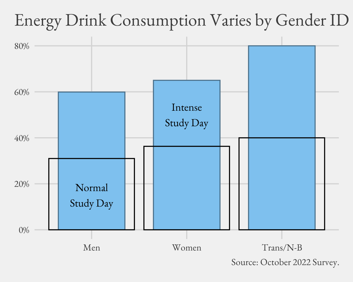 I know I was surprised to find that women on campus were higher consumers of energy drinks than men. Not by much, though 5 percent is real. But Denison’s trans/non-binary community outpaces the rest with 40 percent drinking one daily and double that (80%) drinking at least one on an intense study day. There are widespread reports that women more often use (sugar free) energy drinks as a weight loss strategy and we have evidence for that here. Those who say they restrict calories in anticipation of drinking are more likely to use energy drinks (though we didn’t ask about sugar-free choices) – 13 percent more on intense study days.