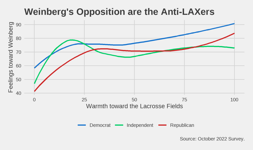 It seems like students who believe that they are receiving the most support Adam Weinberg the most. This is evident because Democratic students who support the lacrosse field support Weinberg the most. Interestingly, Republican students who like the lacrosse field also see the same rate (if not slightly more) of increase as the Democrats. It seems that those who believe that a service or facility that they approve of is being provided support our President more. This makes sense given that most people claim to support who they believe is best for the community but instead support who is best for their self-interest.