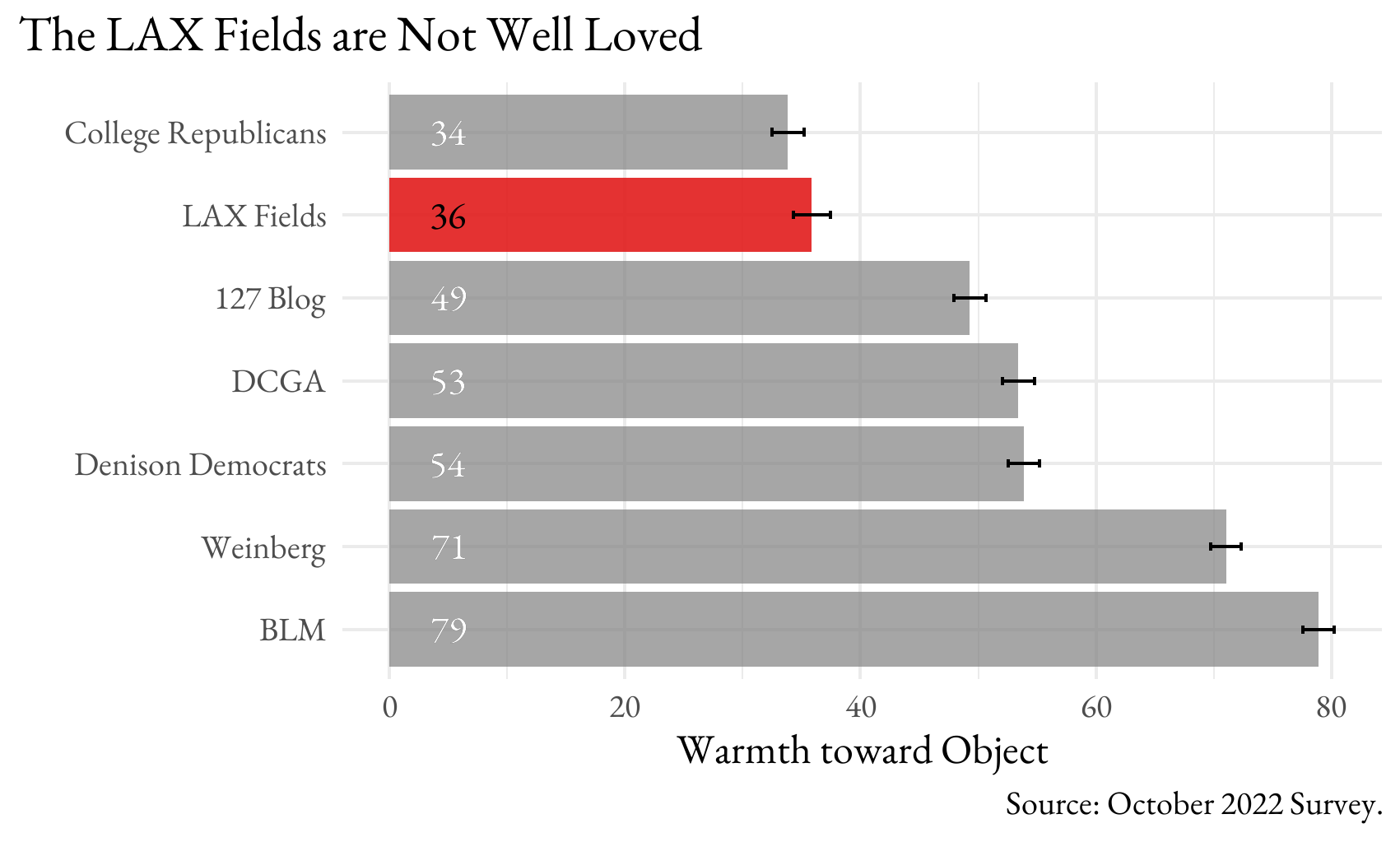 We at 127 couldn’t pass up an opportunity to assess what students actually thought about the LAX fields (which has since morphed into a soccer/lacrosse stadium mashup), which we did in our survey in October 2022 of just over 500 students. Echoing Henry Gamble’s September 2022 editorial, feelings toward the LAX fields run cold – with an average “feeling thermometer” score of 36 out of 100 – in the same space as the College Republicans (though well above Trump’s score of 16).