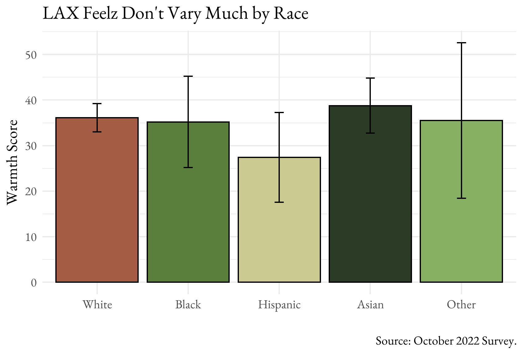 It seems too obvious to gravitate toward race as an explanation, especially when a quick scan of the team roster appears to confirm the stereotype. So that’s why it’s so interesting that there are effectively no differences (statistically significant ones, anyway) between racial groups. Latinos have slightly colder feelings, Asians have slightly warmer ones, but all groups are cool toward LAX. There’s a new maxim in the study of the US that if it’s not about race, it’s probably about politics. Is that true here?