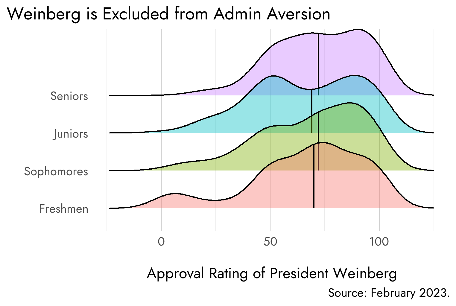 On the other hand, the approval rating of Adam Weinberg does not appear to be burdened by student reluctance to the administration. In my class people favored President Weinberg over the administration because they felt there was a more personal connection to him. He makes himself accessible to students; he can be found at sporting events, club organizations, and even getting lunch at Slayter. The figure below breaks down Weinberg’s approval rating based on graduation year and all four grades are significantly more fond of him than they are of administration.
