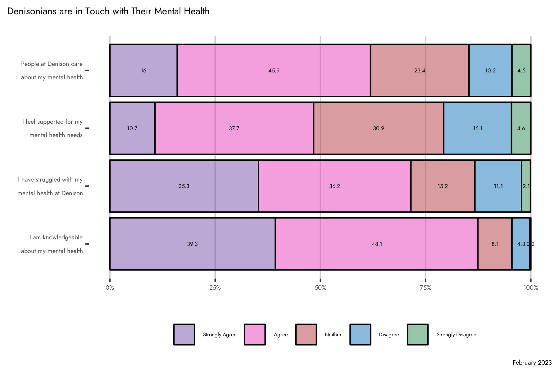 In our February survey, 127 asked a series of questions about how Denisonians perceive their mental health on campus. As shown in the graph below, we found that Denisonians demonstrate a strong understanding of their mental health, however, 71.3% of students have also reported having struggled with it. This signifies an area for improvement because only half of the population disclosed that they feel supported in their mental health needs (though a sizable bunch – 30% – have no idea).