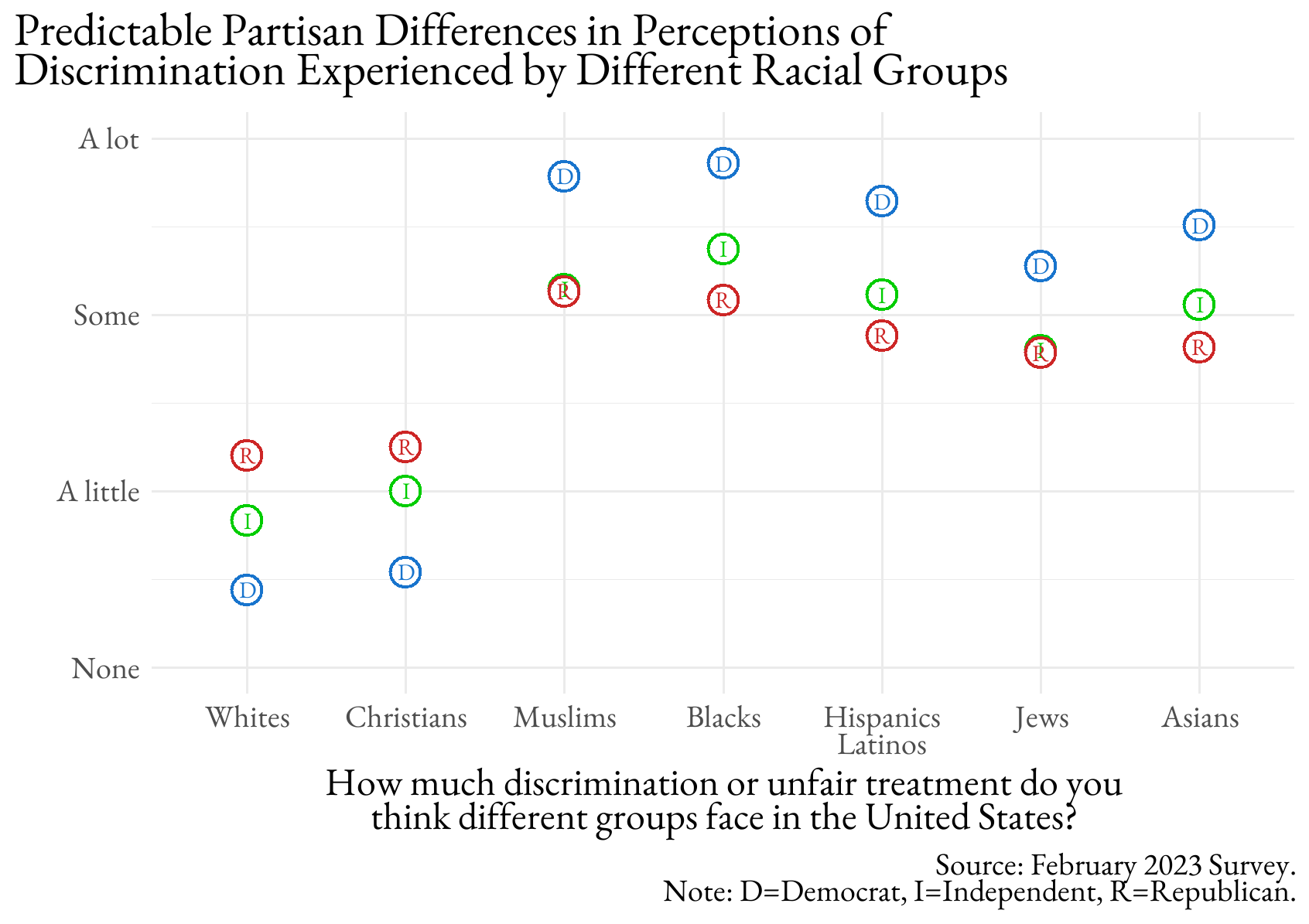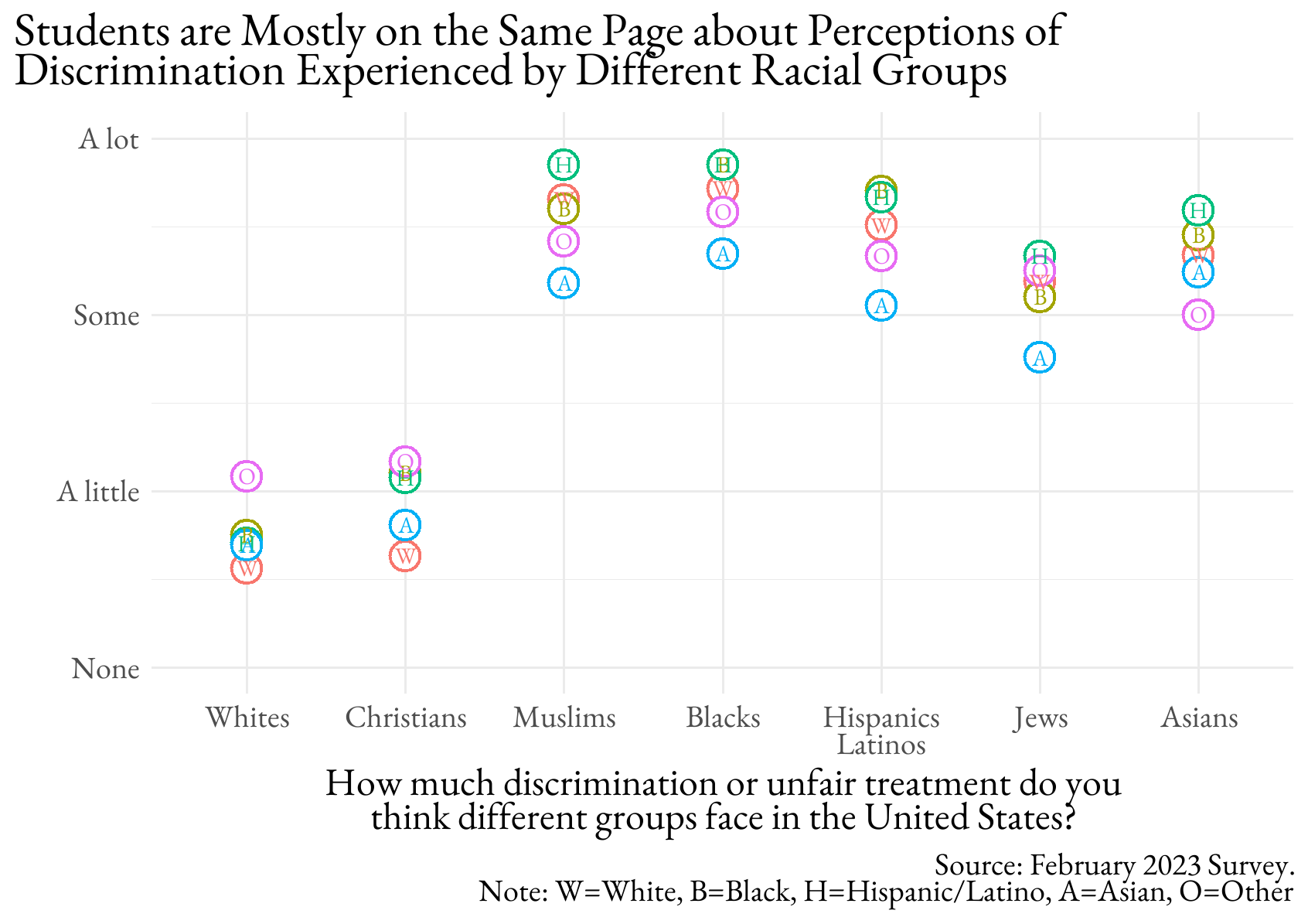 Instead, all groups believed that racial minorities and two religious minorities experience considerable unfair treatment. Hispanic/Latino students perceived the most discrimination consistently, while white and Black students were often indistinguishable. It is interesting that Asian students perceived the least. But, if some of those students are international students, then they would not have the same evidentiary basis for comparison as domestic students. The other notable thing is that Muslims and Blacks are seen as experiencing the most unfair treatment, which squares with the evidence, especially in the pandemic.