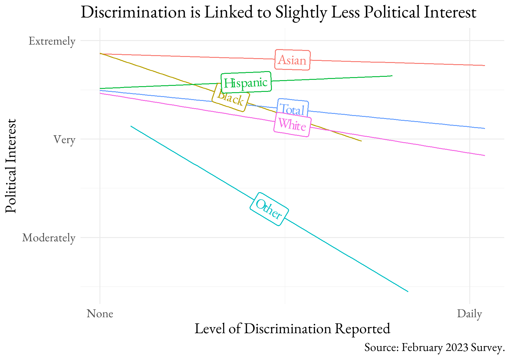Yes, it does make a difference. I matched up the groups, so correlated the belief that whites face a lot of discrimination with political interest among whites. For most groups it doesn’t make a difference, but for Blacks, believing Blacks face more unfair treatment is linked with more political interest. This is not surprising since Black Americans have developed a very strong worldview, rooted in the Civil Rights movement and beyond, to combat discrimination in all its forms.
