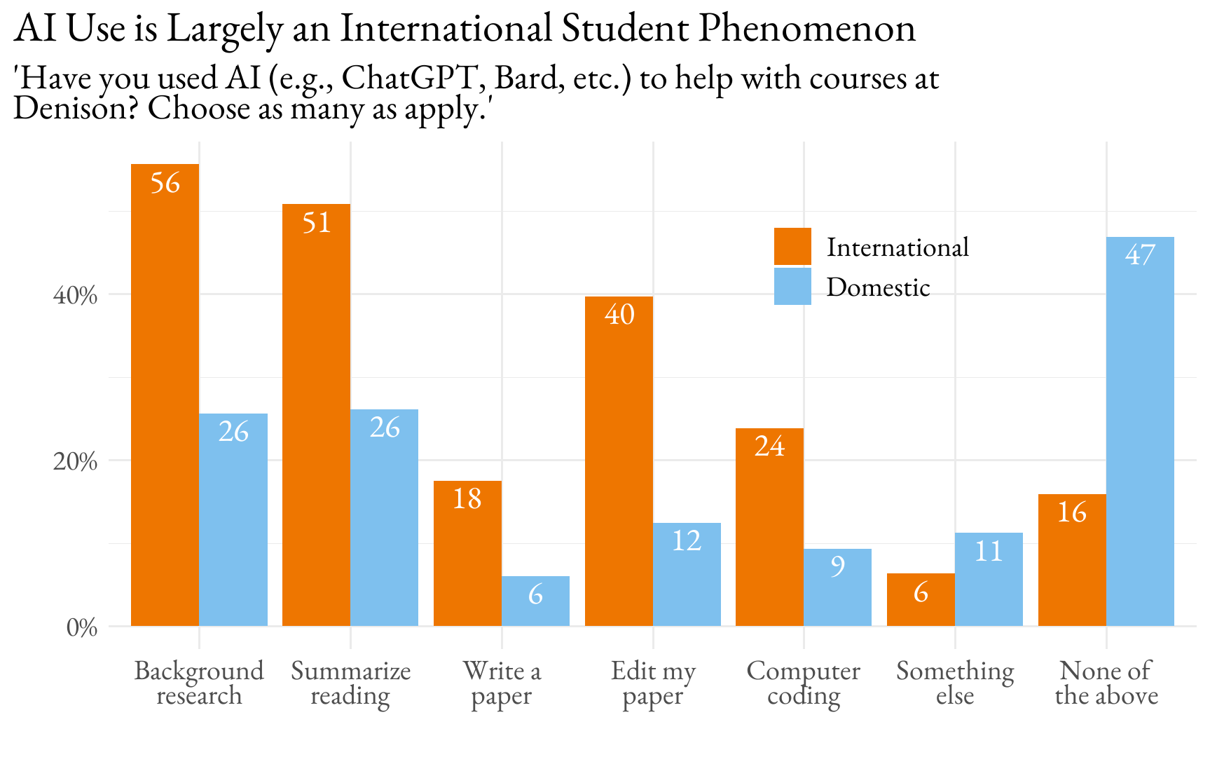 We asked about a range of possible uses prefaced with the disclaimer that admissions here are not violations of academic integrity because they are not tied to any course or assignment. It’s clear that a majority has used AI for something course related, but there’s diversity in what that is. Mostly students are using AI, like ChatGPT, Bard, or Bing, for background research and summarizing readings. Only a small minority admit to using AI to write a paper. Clearly some are using AI for more than one task, but they are not common. Just 1 percent admits to all uses and 40 percent have used AI for 1-2 tasks. So, usage on campus is fairly broad, and certainly not deep.