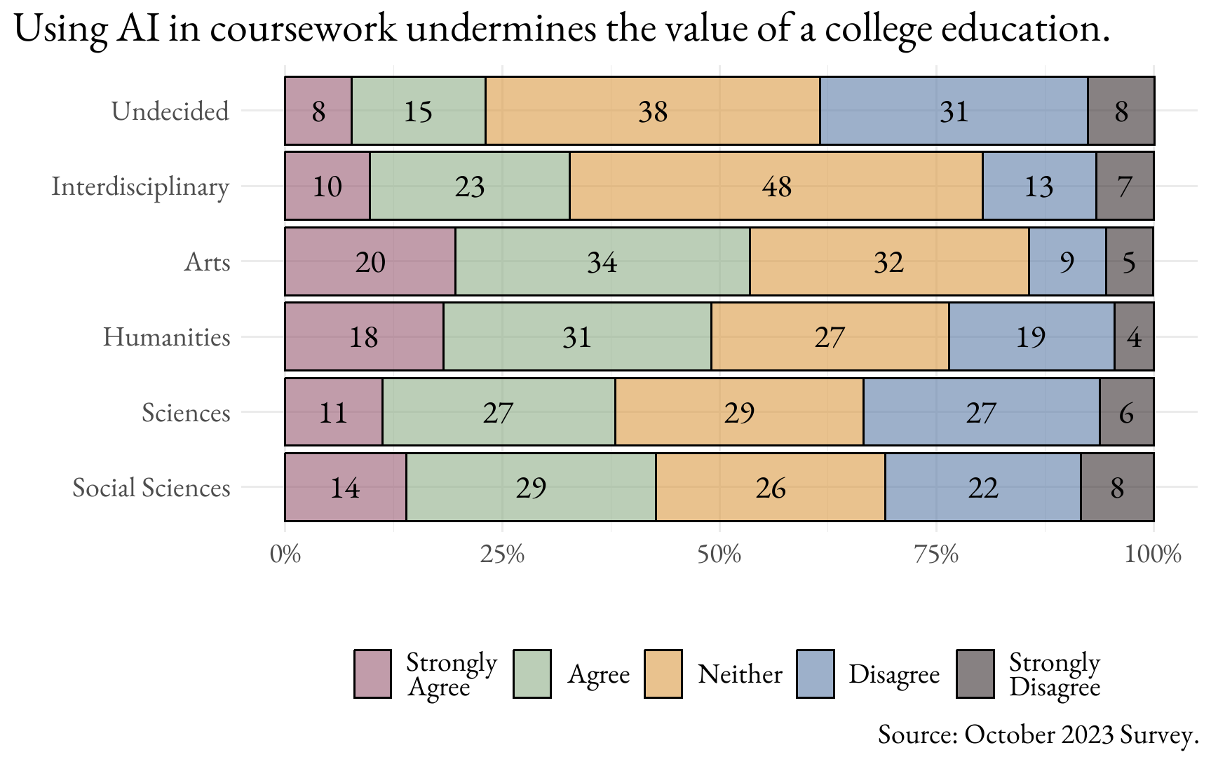 I want to close by showing a couple of attitudes about AI that students have, which may vary by major. Overall, 40 percent of students agree that AI undermines the value of a college education, but the response differs considerably by major. As I expected, the arts and humanities majors lead the way with majorities (or nearly so) in agreement. Science and interdisciplinary students are the least likely to agree, perhaps because they have already seen useful applications. What is striking about these results is the amount of ambivalence – near majorities of interdisciplinary students are on the fence. And of course large numbers of the undecided about their major are also undecided about AI.