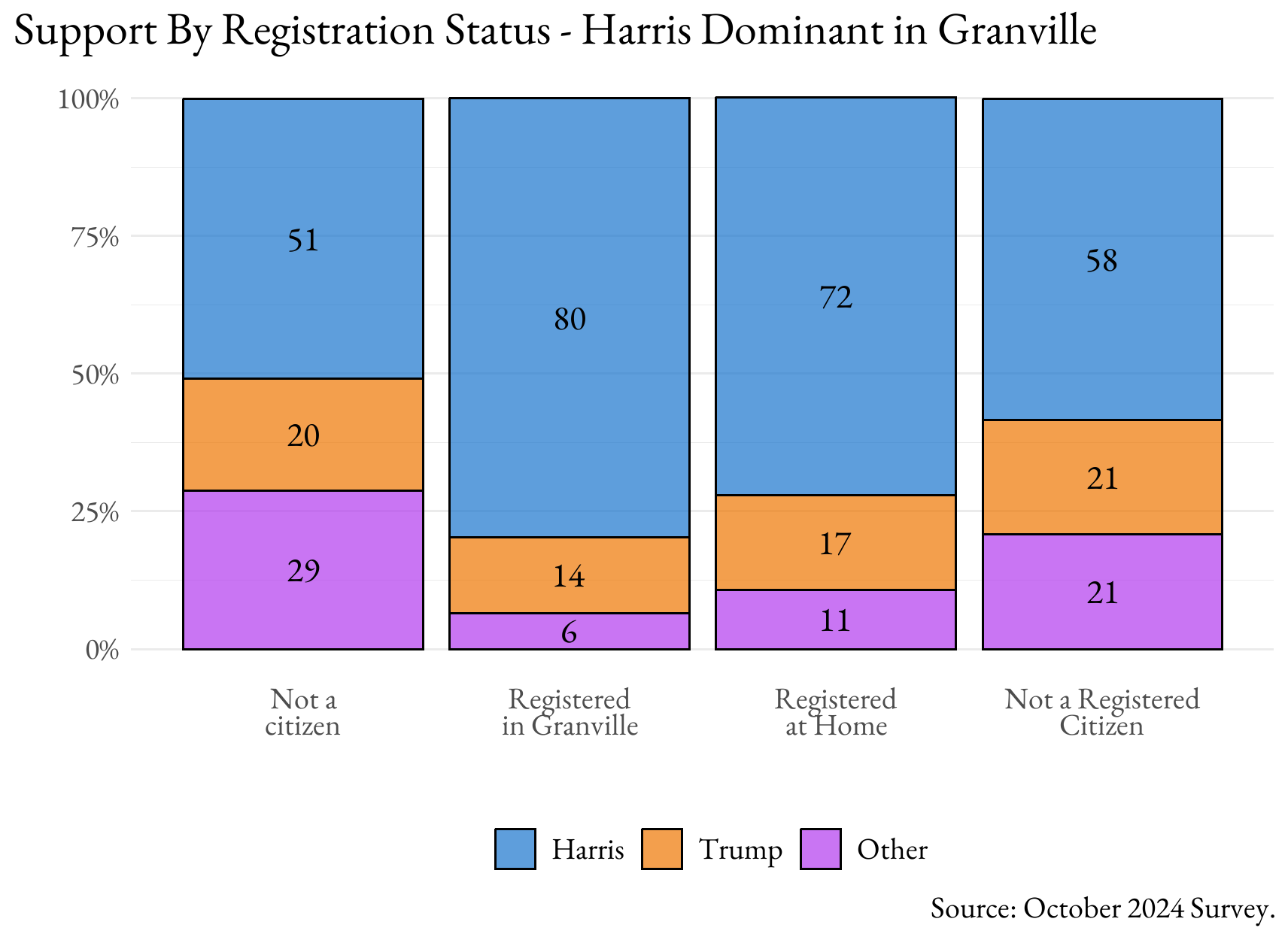 Of course not everyone is registered to vote and many have changed their registration to Granville for a variety of reasons. Maybe they may be more likely to cast a decisive ballot in Ohio (especially the US Senate race) than they can at home. It’s clear that the partisan spread across the registration options draws different voters. It’s clear that registered voters, especially those with a Granville address, are more likely to be Harris supporters. Non-voters are closer to split and, in that way, look like the preferences of international students. Harris supporters on campus are not going to swing Ohio in her favor, though they could help out Sherrod Brown who is in a very tight race with Republican car-dealer Bernie Moreno.