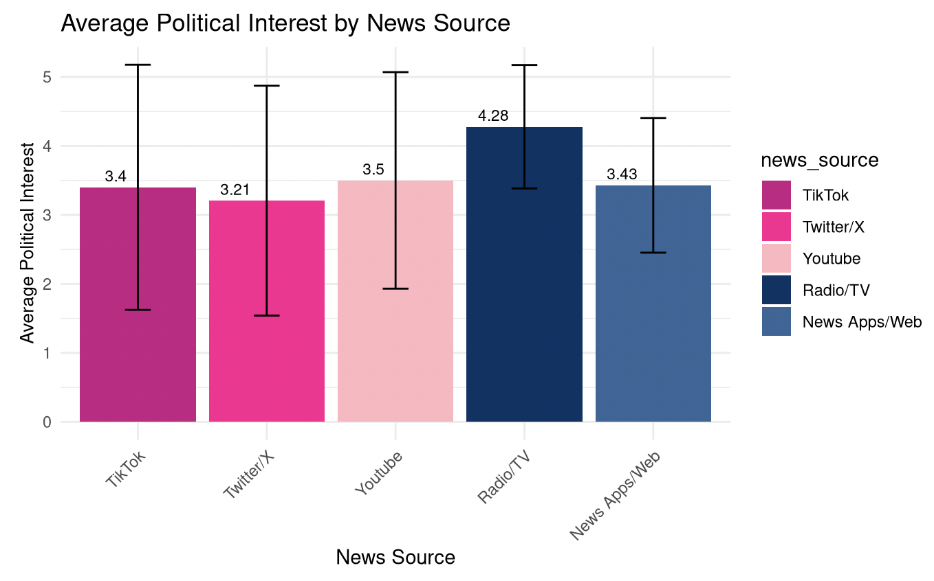 But not only does the use of non-social media platforms correlate with higher political knowledge on campus, it also indicates greater levels of political interest and engagement. When students were asked to rate their interest in politics this year on a scale of 1 to 5, where 1 represents “extremely interested” and 5 represents “not interested at all”, those who frequently used radio or television sources reported higher levels of political interest than users of any social media platform.