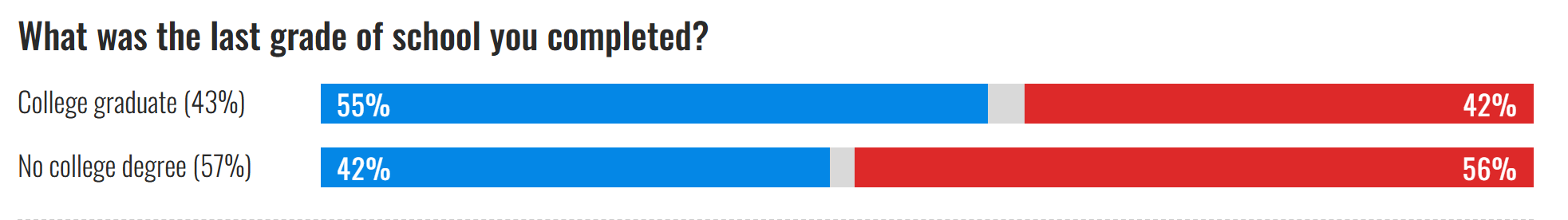 1. Denison isn’t “young people”. There is a growing educational divide in the US that really took off in 2016 and has continued since. College-educated Americans are growing in number and increasingly Democratic, but they still constitute a minority of the population. Currently, 37.7 percent have a college degree or more and there’s a slightly higher rate among women. If the Democratic Party can’t overcome the perception of being coastal, educated elites, they won’t win.