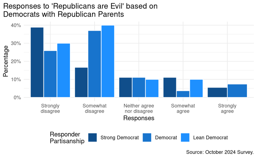 Ok, yes, Freud might be right; maybe it is all our parents’ fault. But how do their political beliefs shape how we perceive them? According to our survey, Strong Democrats, Democrats, and Leaning Democrats are more likely to strongly and somewhat disagree that Republicans are evil. This further confirms my first hypothesis: our views of political supporters change when we add a familiar face to them. Nonetheless, it is worth noting that, despite having a close familial tie with Republicans, some Strong Democrats and Democrats strongly agree that Republicans are evil. So, a few of us still hold their political beliefs close to their heart — at least closer than their parents.