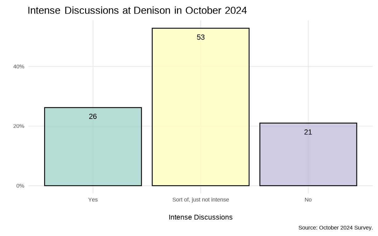 In 127’s most recent survey, we asked Denisonians whether they had had an intense discussion (marked by disagreement) about any topic with others at Denison (outside of a class) this year. Of the nearly 500 students surveyed in October, 26% reported having intense discussions on the Hill, while 53% reported “Sort of, just not intense.” This answer is how I would categorize my own conversations with my friends – some feelings of frustration, riddled with varying opinions, but not necessarily intense.