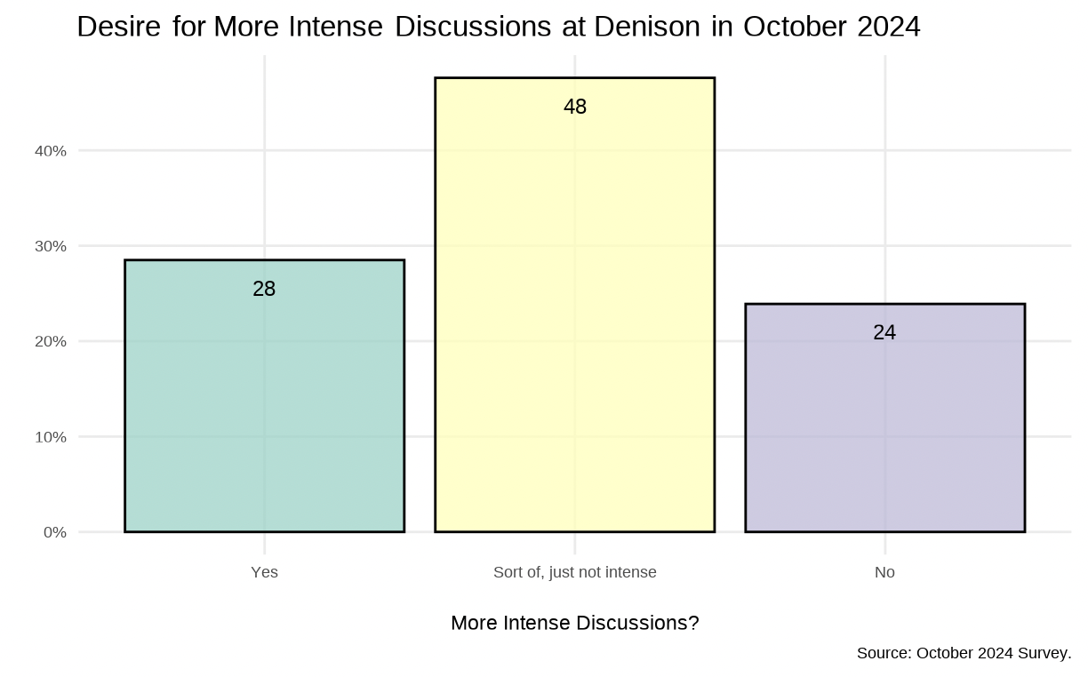When asked if they would like to have more intense discussions with others, students reported similar patterns: 28% said Yes, 48% said Sort of, and 24% said No. Both figures suggest that Denisonians do have an interest in engaging in conversations with others but they are not interested in a tense debate. This could be due to a variety of reasons, from Denison’s small size – the likelihood of running into that person you just had an uncomfortable conversation with is very high – to the prominence of cancel culture. These combined could quickly lead to social ostracization and a nasty YikYak referring to you only by your initials (but still making your identity completely obvious).