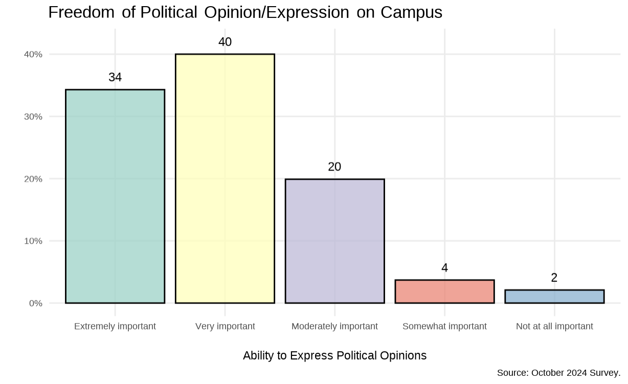 I wonder if this interest in intense discussions translates to perceptions about political expression on campus. We asked students how important it is that students feel comfortable and are able to express their political affiliations and opinions on campus, with responses ranging from “Extremely important” to “Not at all important”. 74% of students said freedom of political expression was Very to Extremely Important, while 24% said Somewhat to Moderately, and only 2% said “Not at all.” The results suggest that students feel much more strongly about freedom of political expression than having intense conversations. But don’t those kinda go hand-in-hand? Aren’t intense discussions with people you disagree with a form of political expression?