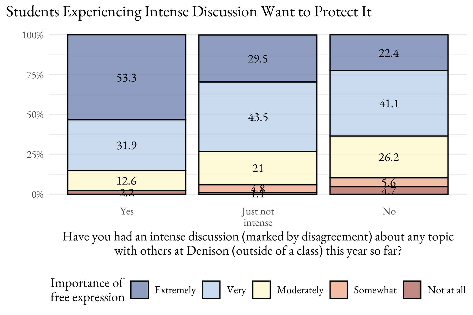 Well, yes. And as the following figure shows, students who have had intense conversations are the most invested in making sure students can express themselves comfortably. A majority suggested it was extremely important compared to just a quarter of those who did not have an intense conversation. It’s not that the latter two groups think protecting free expression is unimportant, they’re just not quite on fire about it.