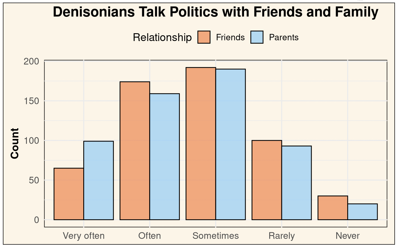I grew up in a household where my political views closely aligned with both of my parents. When we watched the news together, we’d usually mutter a few swear words and insults whenever certain people appeared on the TV. But when I got to Denison, I became part of a friend group where most of us held opposing political views, and many of whom come from families with different beliefs than their own.