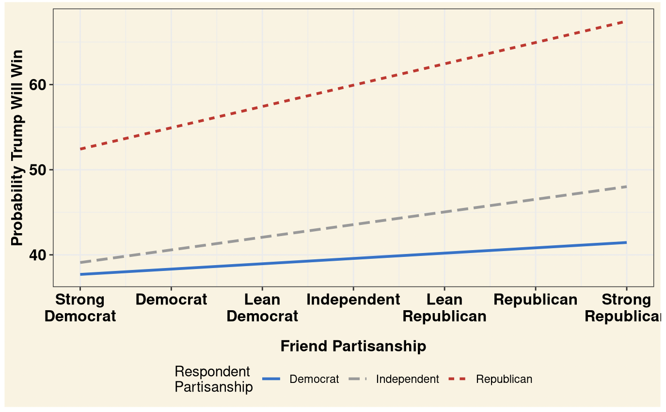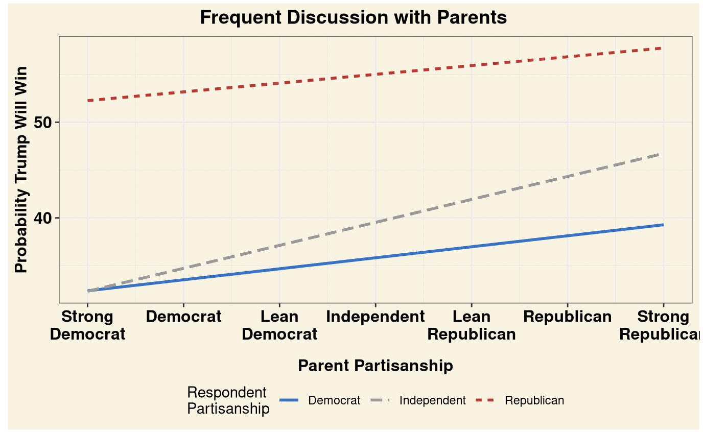 Our data shows (in the figure above) that for Democrats (blue line), being friends with a Republican (to the right on the x axis) does slightly increase their prediction that Trump would win. Though for the most part, Democrats seem pretty confident in their views regardless of who their friends are. Republicans (red line), on the other hand, still strongly believed that Trump would win even when they had Democratic friends, but their faith in his victory was drastically higher when they were friends with other Republicans. But, the impact of a student’s parents’ political views on their own beliefs are even stronger.