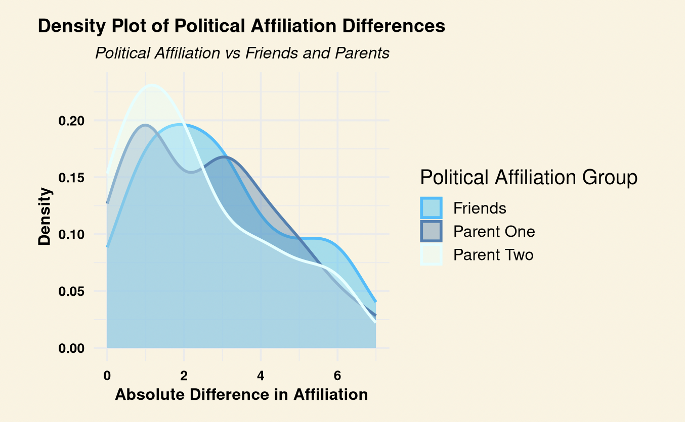 The density plot above shows that high density (a difference of 0-1 point) indicates that students share similar political affiliations with their friends or parents. Data that falls to the right on the graph shows greater differences between political alignments. Students align most closely with their parents, as shown by the peak at the beginning of the graph. While they also share similar views with their friends, the alignment is slightly weaker, as indicated by the bulge at the high end of the x axis.