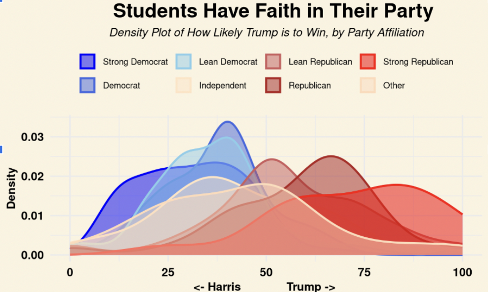 Both Democratic and Republican students’ prediction on the 2024 election was more heavily influenced by the beliefs of their parents. Students whose parents belong to opposing political parties tend to have less confidence in their own party’s candidate compared to students whose parents share the same political affiliation. This makes sense, as people tend to align more with their parents’ views, given the stronger influence family often has on our beliefs.