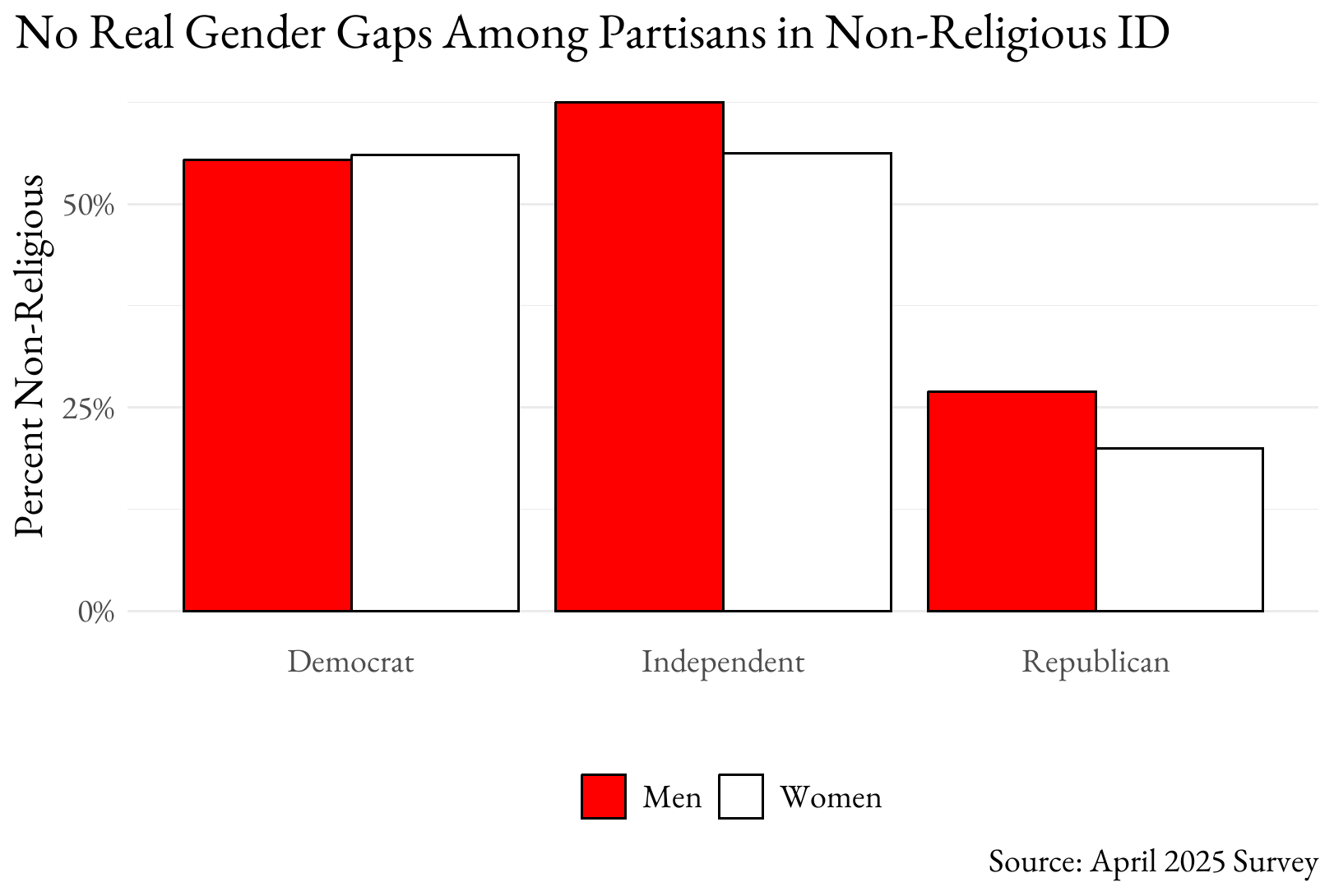The way that this produces a gender gap overall is that men are more likely to be Republican than women. Therefore, the political gender gap is strongly linked to the religious gender gap.