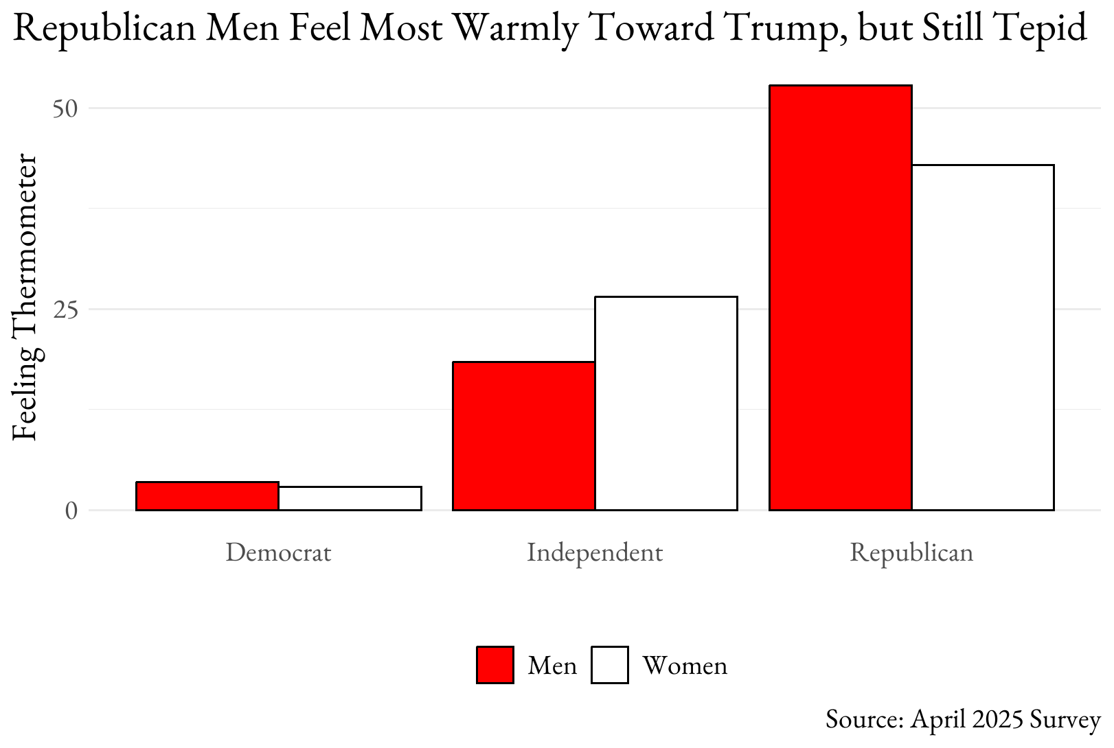 It looks like Denison Republicans are cut from different cloth than national Republicans. They don’t appear to be on the same page about the conflation of religion and the state. We can see it in how they feel about Trump, too. Sure, they have warmer feelings toward Trump than everyone else (see figure below), but those feelings are lukewarm rather than blood-boiling hot, which is what you’d expect in this highly polarized age.