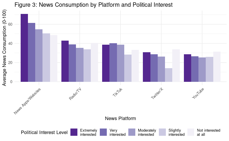 These varying levels of political interest directly relate to news engagement. Figure 3 shows the average news consumption from various platforms, broken down by interest level. There is a positive linear relationship, as interest increases so does news consumption. This trend is most obvious among more traditional news options: news apps/websites and radio/tv. Youtube, though, stands as an outlier as it is rarely used for news regardless of political engagement.