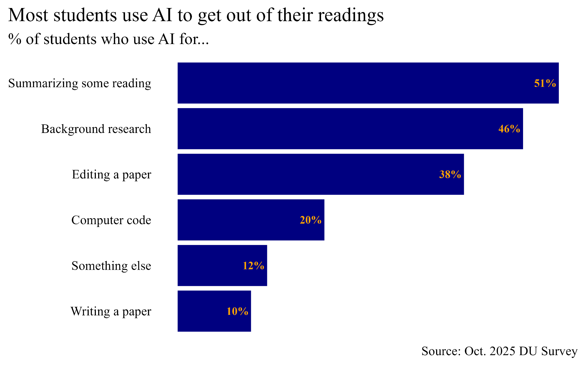 What amazes me, though, as it also did when I saw the spring survey results, is that only 1 out of 10 students say they use AI to write papers. Do students really exercise this kind of self-control?