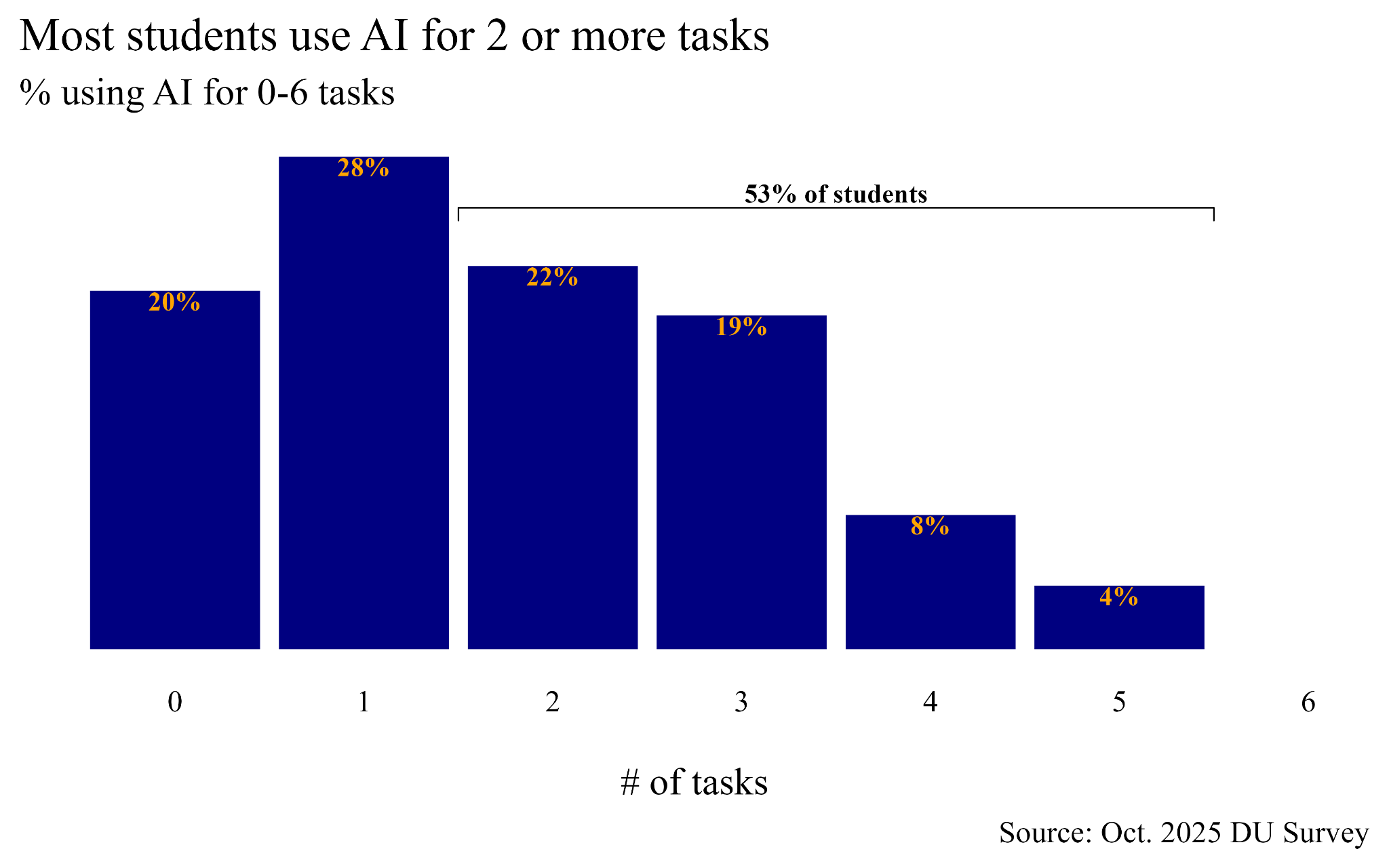 One other thing I found in the data is that students who use AI for one task tend to use it for many. When you count up the number of different tasks students say they use AI to help with, 53% say they use it for 2 or more. You can see this in the figure below. Use does taper for higher numbers of tasks, though. Very few use AI to help with 4 or 5 different tasks, and none use it for 6. But only 28% use AI for help with only one thing.