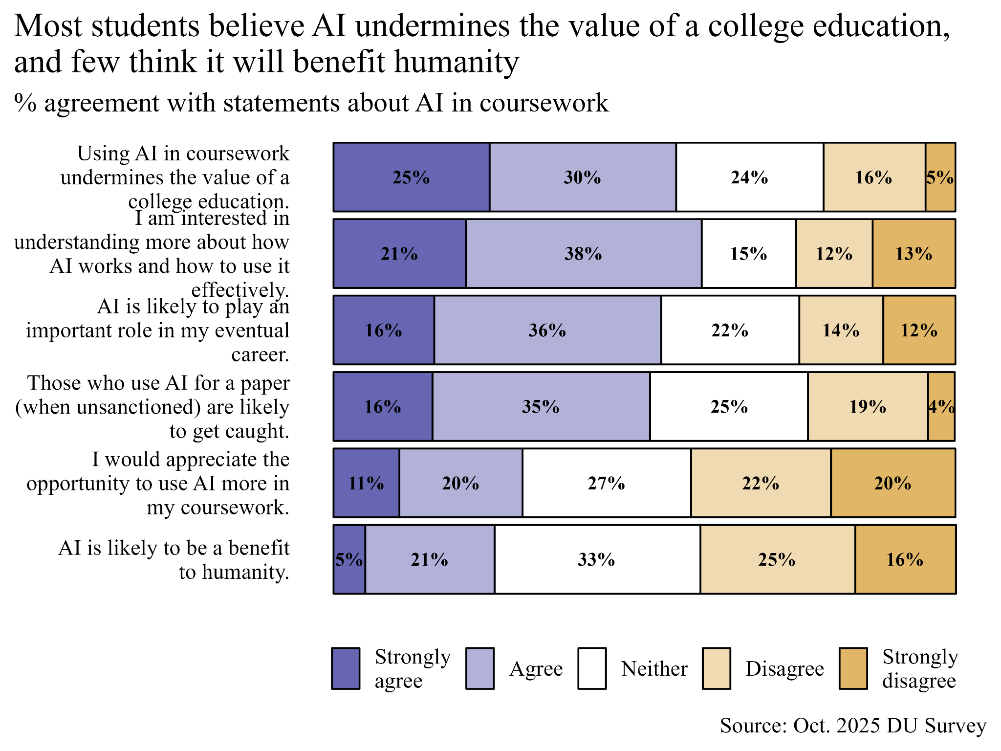 I always find it interesting when unexpected discrepancies show up in data, and when I moved from looking at stats on student AI use to AI attitudes I was not disappointed. Students were shown six different statements about AI and asked to indicate their level of agreement with each. I summarized the distribution of student responses in the figure below. Even though 80% of students say they use AI for help with coursework, 55% agree that using AI in coursework undermines the value of a college education. Also, only 26% agree that AI will be of benefit to humanity. At the same time, 59% have an interest in understanding how AI works so they can use it more effectively, and 52% think it will play an important role in their future career, but only 31% want more opportunities to use AI in their coursework. Contradictions across the board!