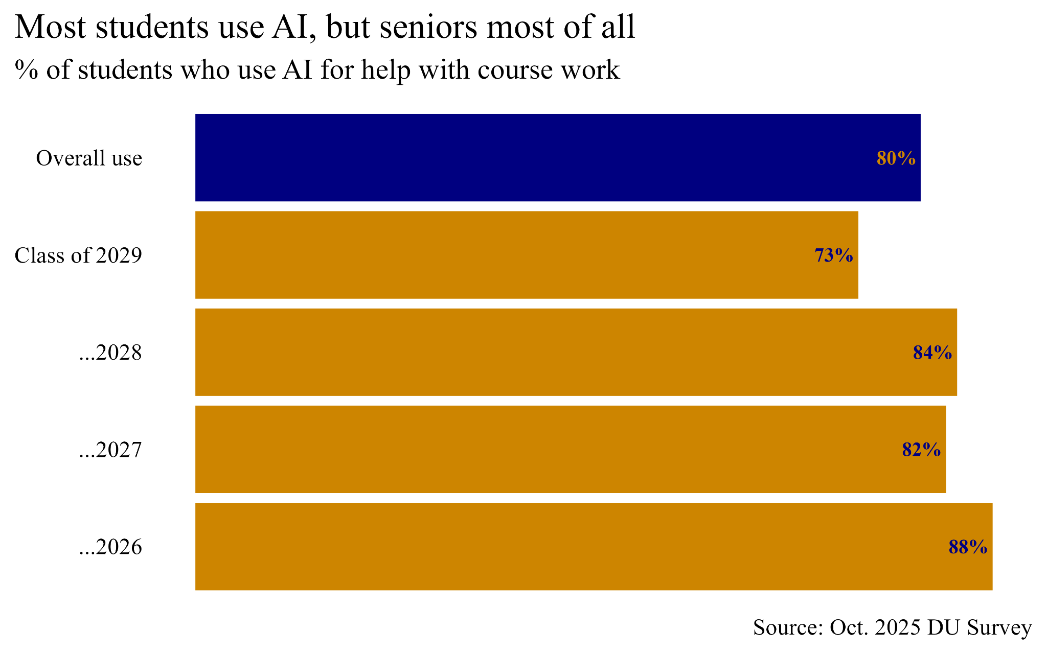 Given the growth in usage in the last academic year, I’m actually surprised that the current rate isn’t higher than 80%. Either some of the remaining 20% of students lied, or a big upsurge is coming next semester after freshmen have better acclimated to this brave new AI world. My hunch is that the latter explanation is the better of the two, and the data backs me up, which you can see in the figure below. When I broke the data down by year of expected graduation, I found that freshmen reported the lowest AI use rate at 73%. Seniors had the highest reported rate, coming in at nearly 88%. I bet that come the spring semester, some AI holdouts among the freshmen will cave, which will bring up the overall average.